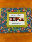 We wanted the gallery card to be part of the cover. So I made a window in a thin piece of cardboard (almost card stock in thickness). That was where the card was to sit. After gluing on the cover paper, I just wasn’t happy with how the card was going to look. It was sort of lost in the busyness of the paper. So I then decided to glue a “frame” using the chartreuse book-cloth tape. I then glued the card in, and really didn’t like it. It seemed that it needed something to “push it into” the book. So I redid the border again, this time over the card and it looks fine. More work than was needed in my opinion. Next time I will learn my lesson on it.
