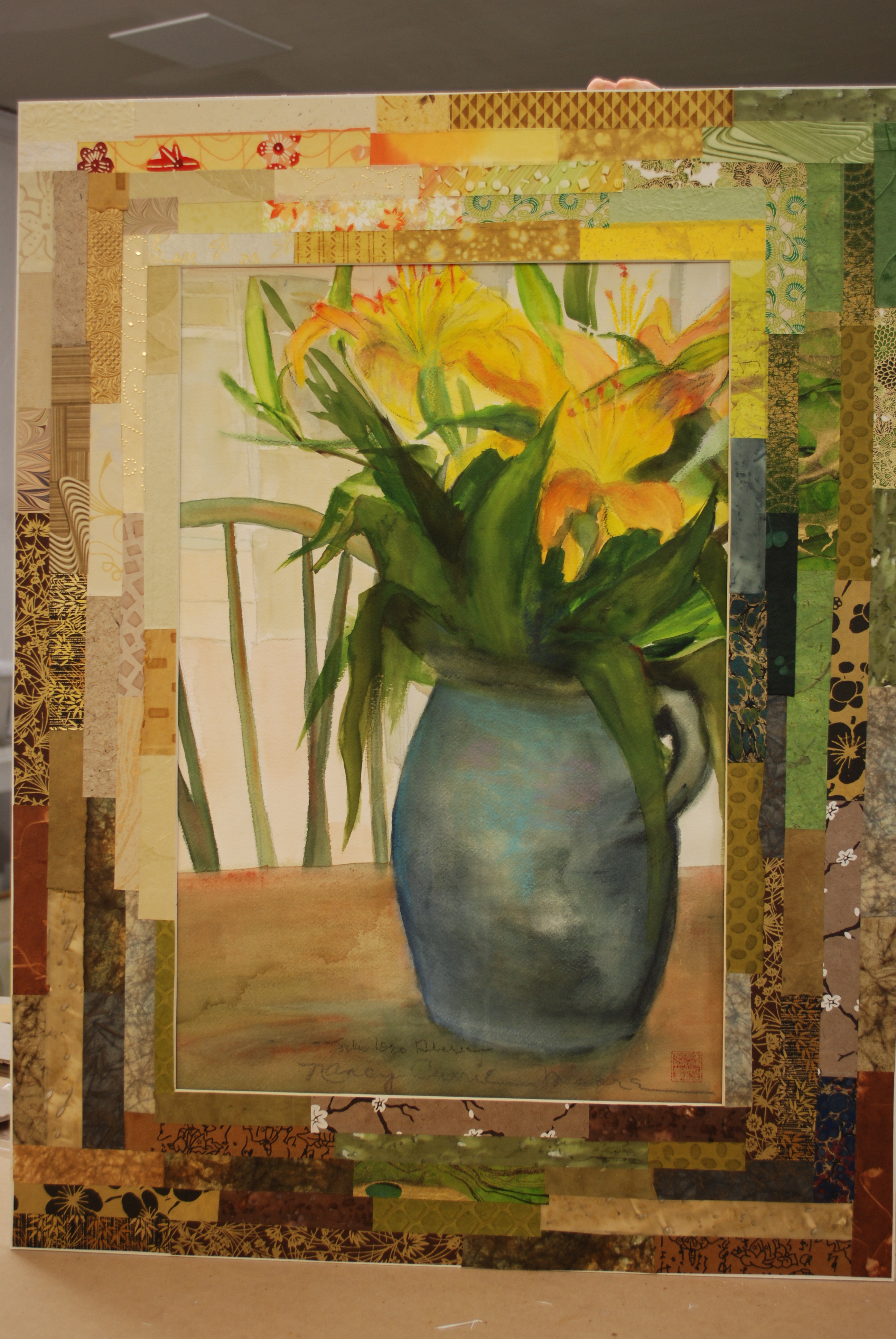 Earlier in her visit, this same patron greatly enjoyed my art. She loved the color in my mats and all the japanese papers. She is a real fan of Asian art and we spent a great deal of time telling her about our adventures in Japan paper shopping. That is when Mom suggested that I create a mat for Day Lillies out of japanese paper. The patron thought it was a great idea – so the deal was set.