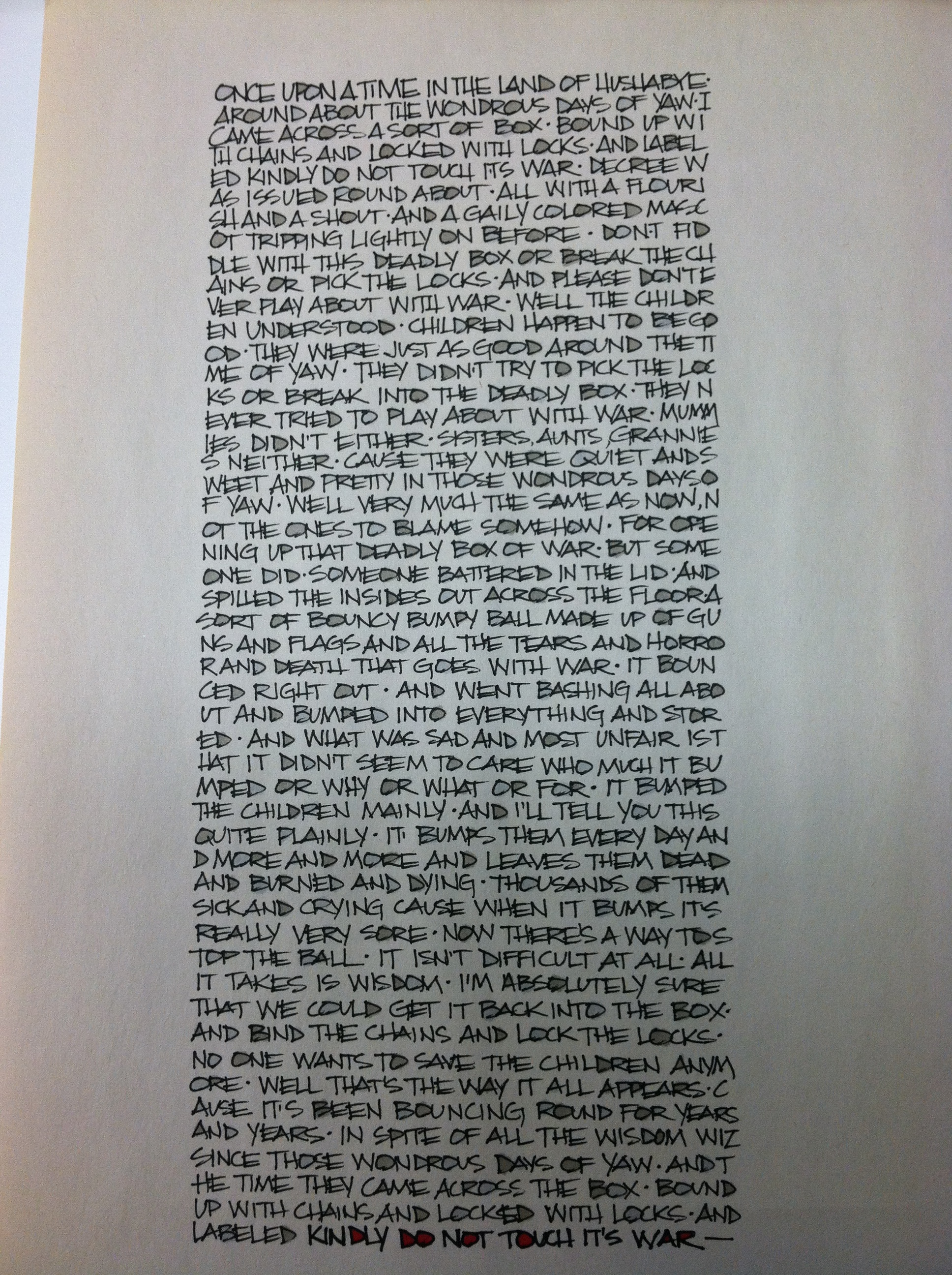 To the left is a shot of the final piece. It measures 15×22 and has not been framed yet. The original idea was to create a piece that covered the wall and allowed people to read it clearly and dramatically. This one works because it is subtle, yet dramatic, somber and thought-provoking. With the left and right alignment the same, I actually wrapped the text on each line by letter not by word, so there are words that are cut off in the middle to wrap to the next line. It makes it a bit harder to read, however I think it compliments the piece. War is a somber and hard topic to understand, and I feel this piece reflects those complexities.