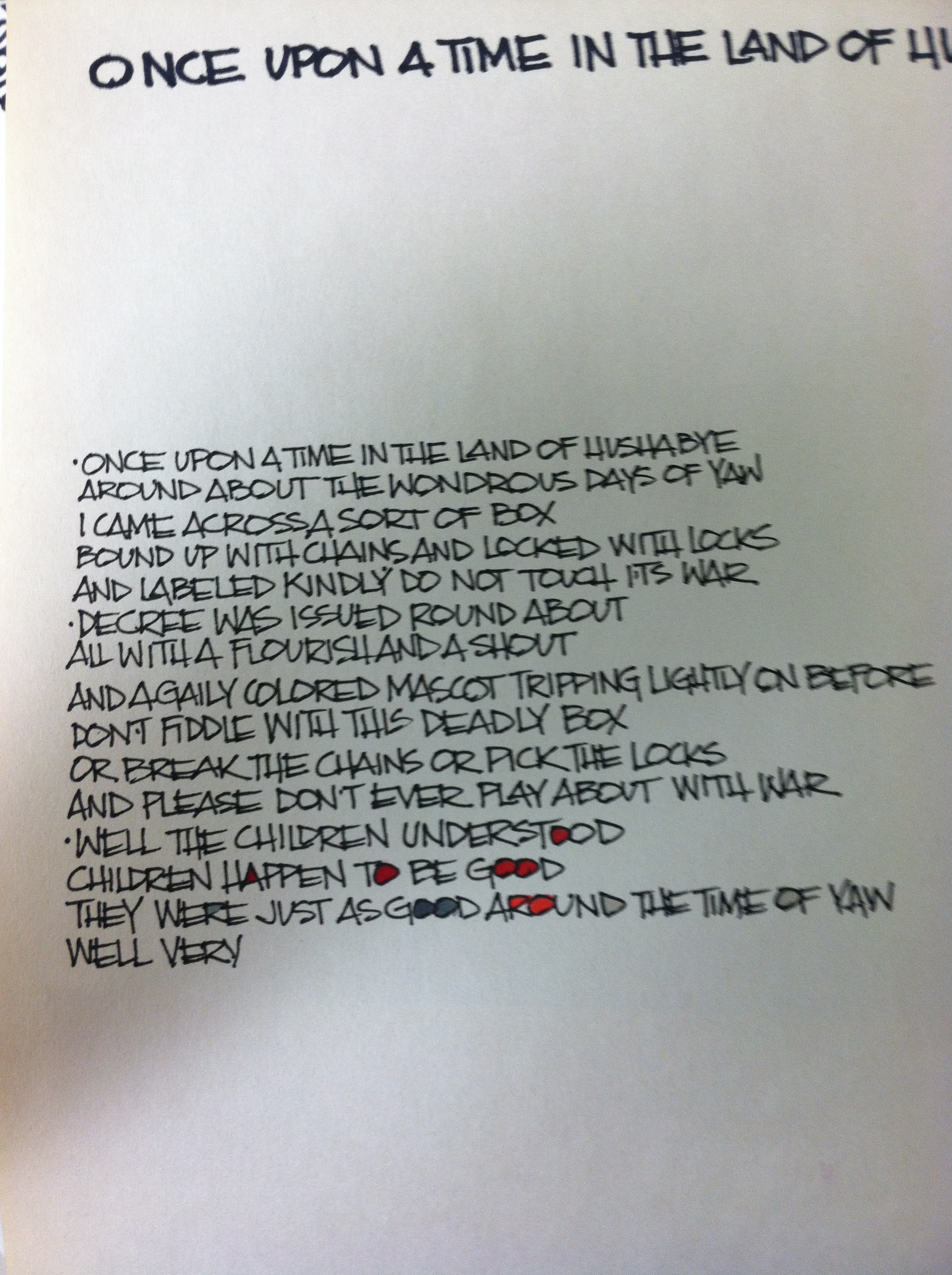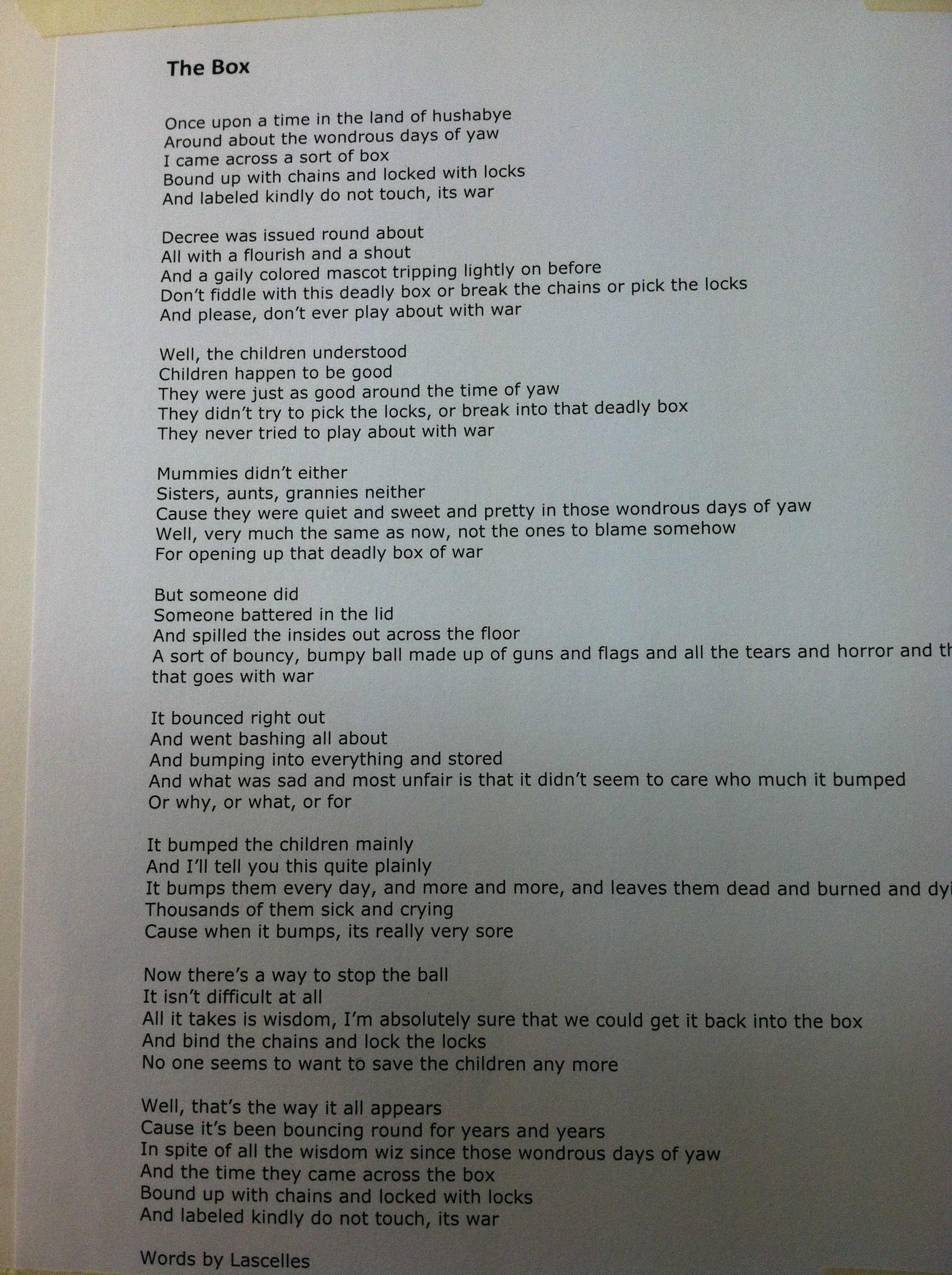 within my creativity. It helps to store them in a single place, so I can go back and reference them when I want something new to work on or feel bored and want to develop a new piece. The Box was one of those texts. I had found it online and saved it in my journal. You can see here a picture of the text as I had it saved in my journal. Pretty straight forward text and pretty boring. It is a long poem about war.