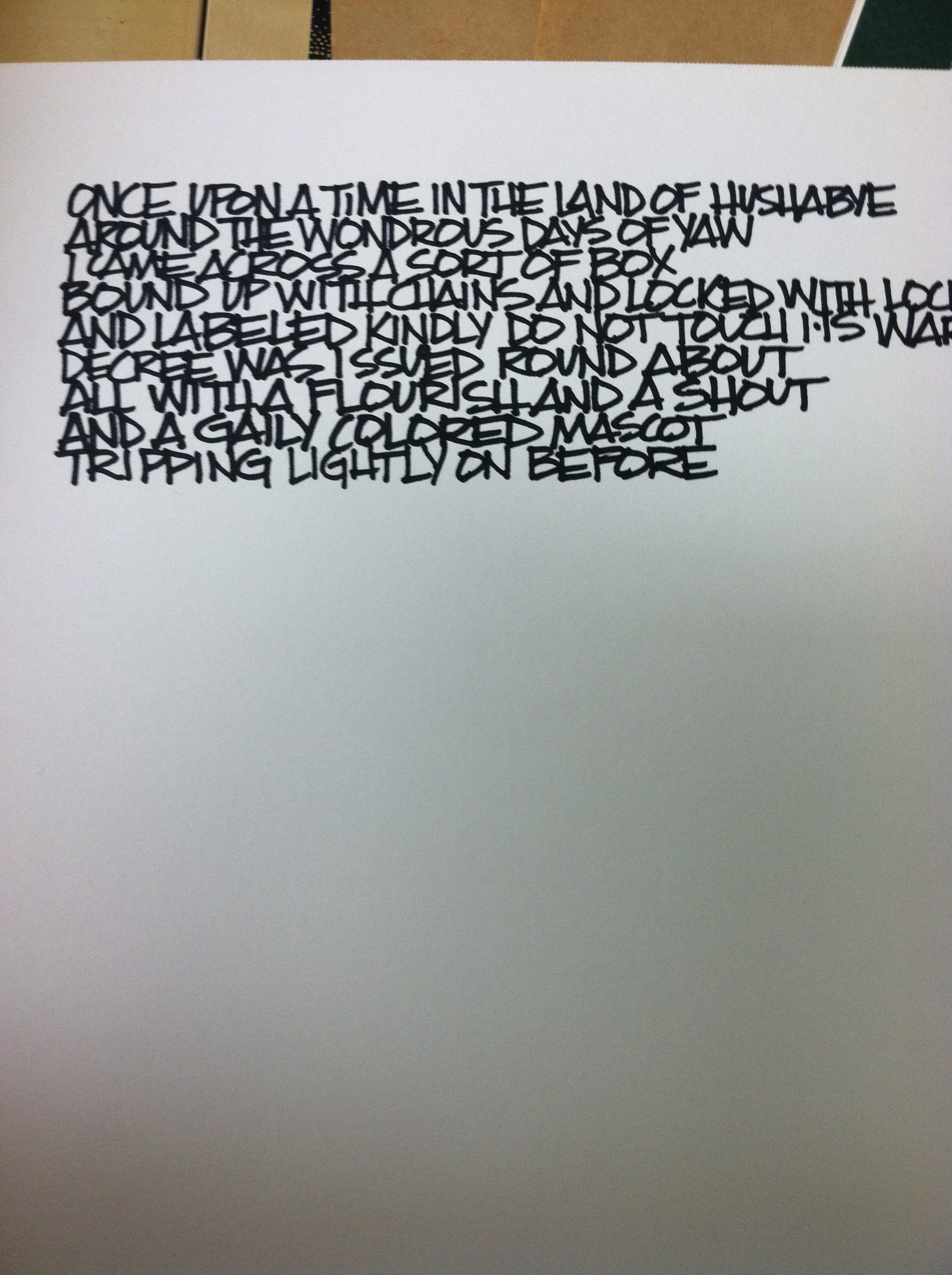 I am working on an application for a national show, and I wanted a different piece for my portfolio. I scanned through the ideas in my journal, and The Box popped back into my head. I wanted something different that brought a different look into the pieces I was submitting for the show. So began writing the text as my original notes suggested. Bad Idea.