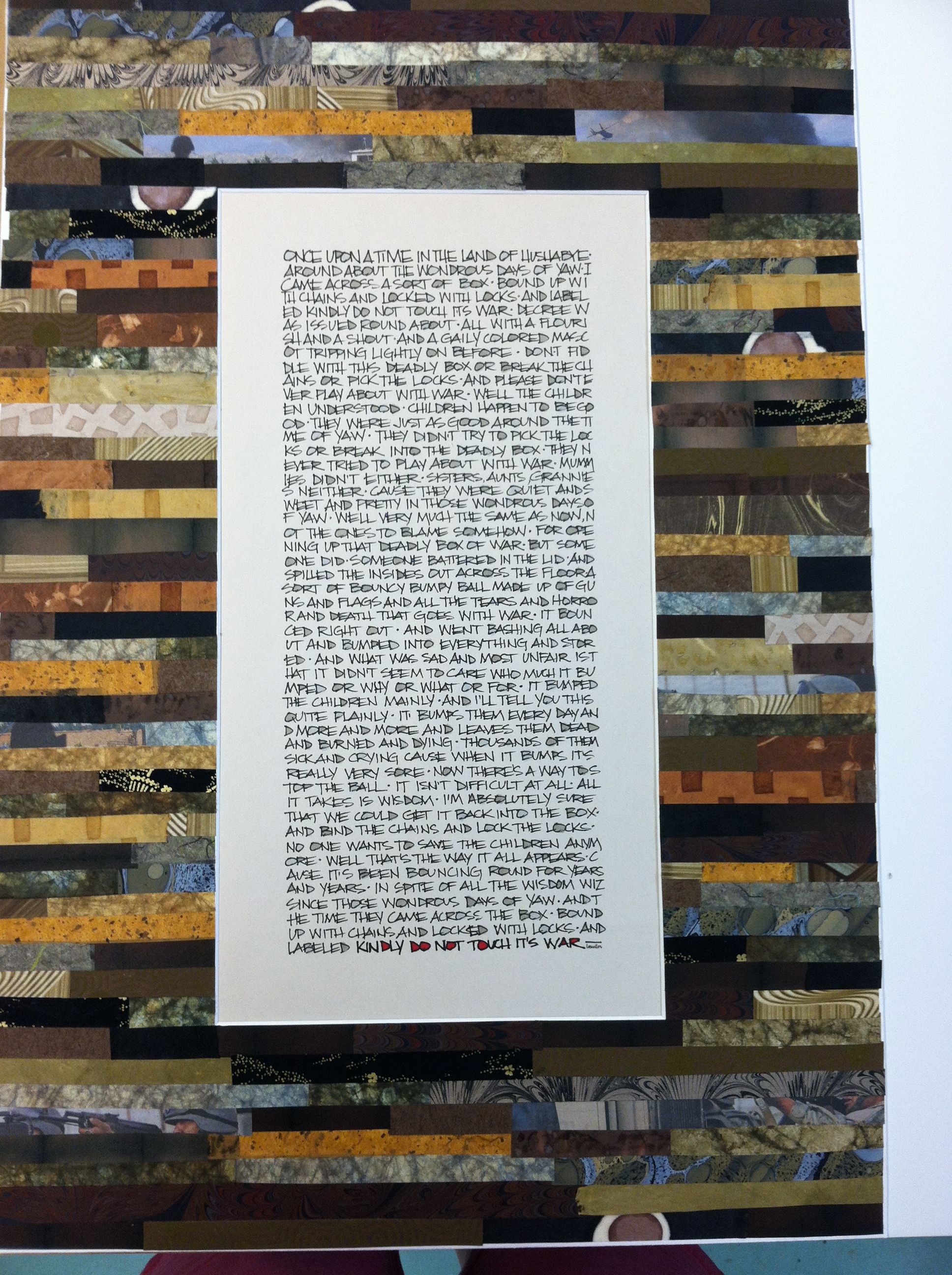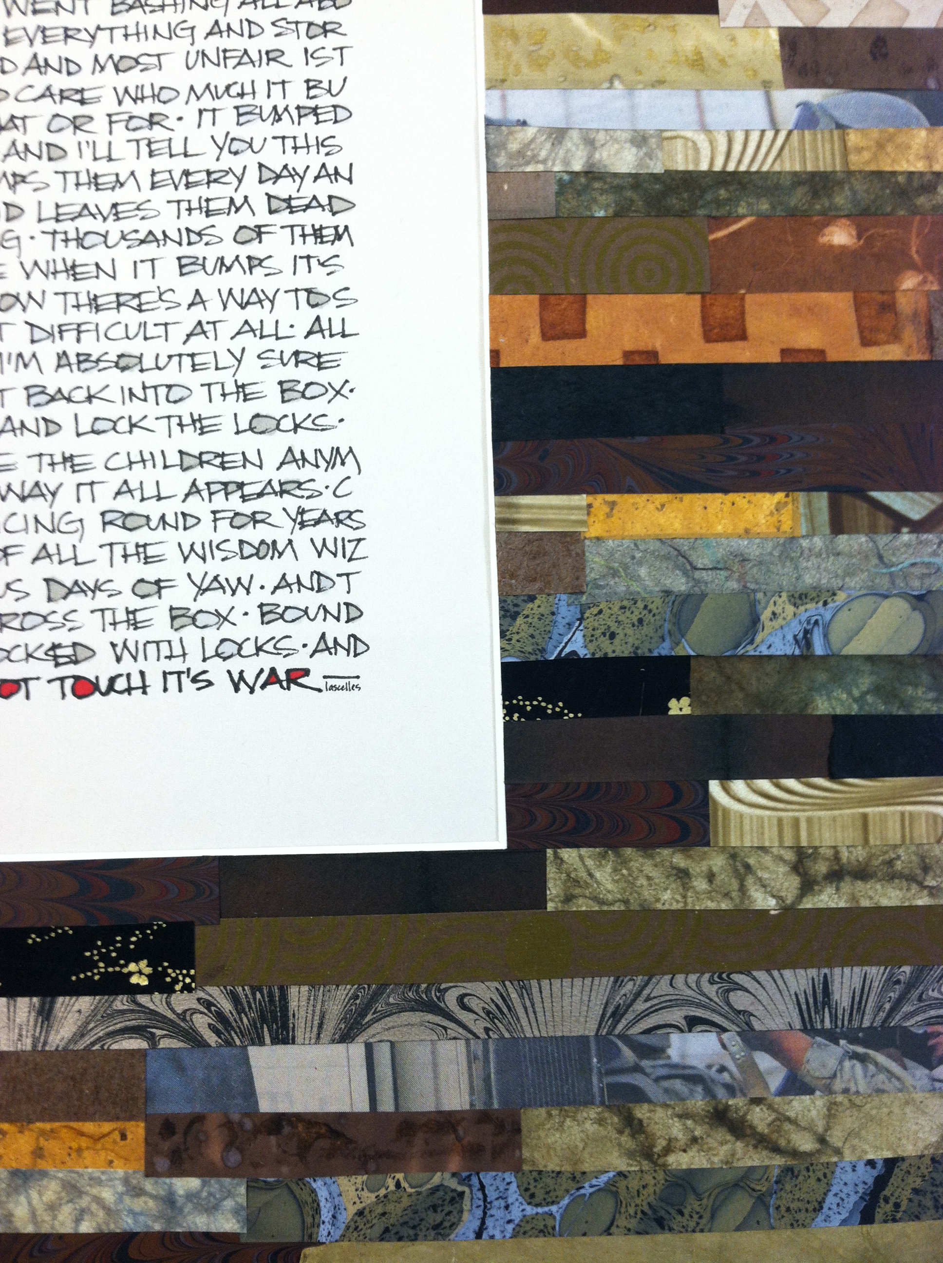 As the original piece turned out smaller and more boxey than I had originally imagined I had to approach the mat from a new perspective. I usually complete the mat first, then write the text to match the colors of the mat. In this case, I was so frustrated by trying to get the text correct that I had not even attempted the mat. The text is somber. It describes war as a bouncing ball of destruction that we need to get back into the box. As a result, I wanted a mat that was different and looked like a wall. I cut the mat board and began working.