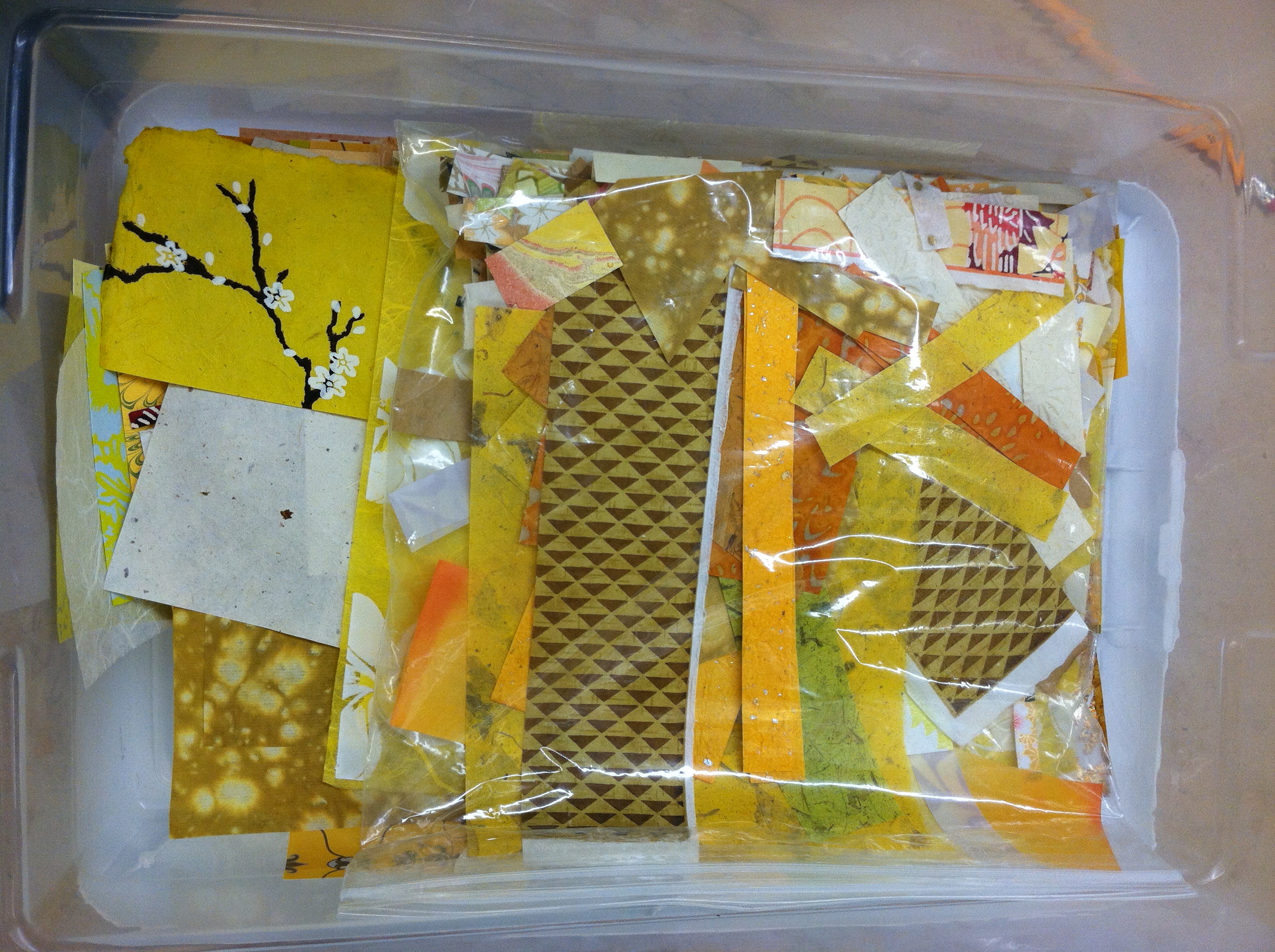 To the right are the blues from my scrap box that I chose to get started. They are mostly Japanese scraps we bought while in Tokyo and Yokohama Japan. I like how they compliment the accent blue on the paint sample and seem to blend with the blues in the carpet samples. But blue was not the only color I chose to use, so here are the other bins I opened to see what I could find.