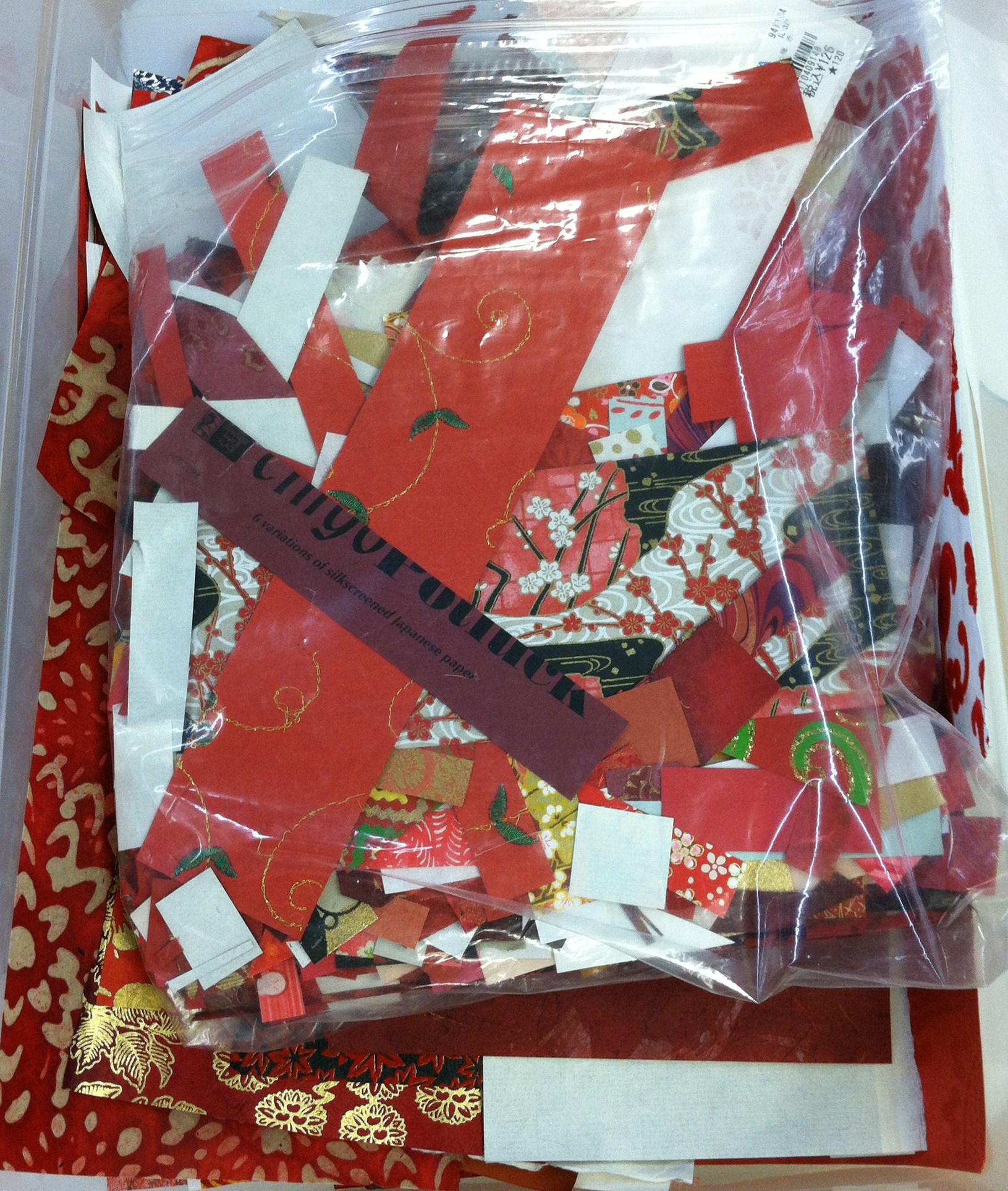 Back to the drawers and bins I go. I pulled more colors for this one, knowing that on this piece I wanted to focus the mat in a different pattern and a more subtle, melting color scheme. Here are the color bins I pulled from – red and dark red. There are hints in each of these bins that inspired me toward my initial thoughts on this mat. I also pulled from the brown and beige boxes, but not until I worked with the papers in groups of red and beige. I found the beige a bit too boring and too close to the wall colors to include in the piece. As you can see from my scrap boxes, I save labels and any size paper bit I can get my hands on. I sometimes wonder what I am going to do with all these bits and pieces, but I know the future holds some very unique artwork just waiting to feature just the right tidbit.