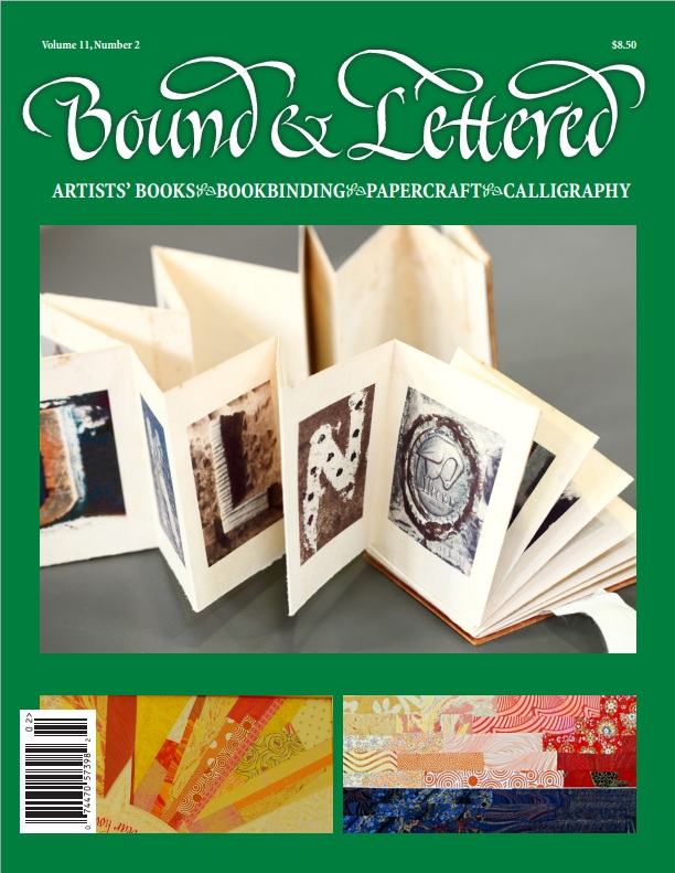 Yes, it’s true. My work made the cover of Bound and Lettered magazine. The title of the article is Marbelized Mats from Paper Scraps and appears on page 28. It is four pages long; it includes photos from the studio flat files, my scrap bins, and 4 samples of my work. It also includes a “how to” example from a commissioned work I recently completed. The bottom of the cover features mat snapshots from two of my pieces that appear elsewhere in the magazine. Here you can see a shot of the cover.