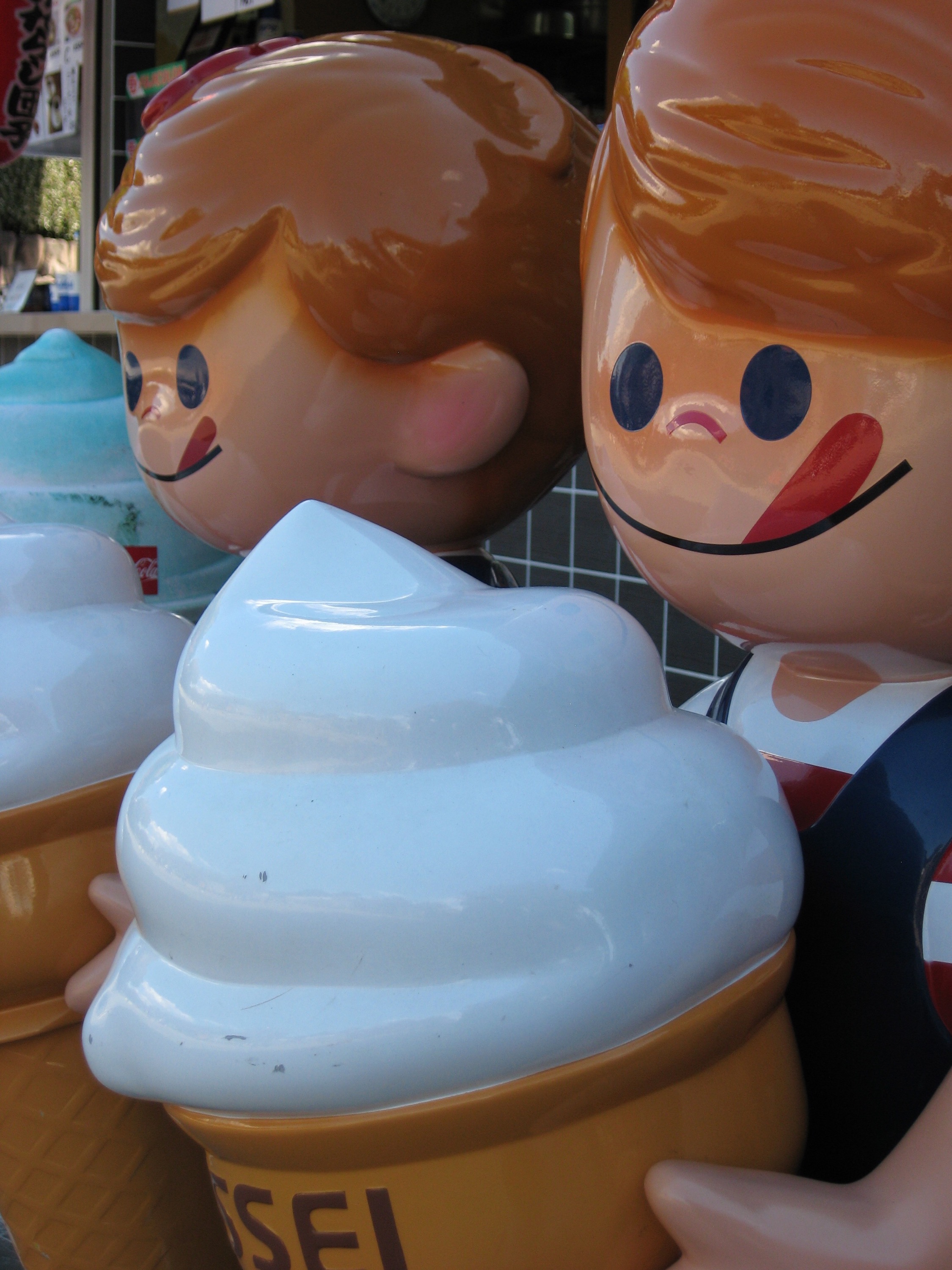 These joyful and yummy characters sit outside an ice cream stand at Osaka Castle in Osaka, Japan. After walking for hours, enjoying the sights, and sharing such a beautiful location…these warm happy faces greeted us! And the ice cream was a welcomed treat to boot!