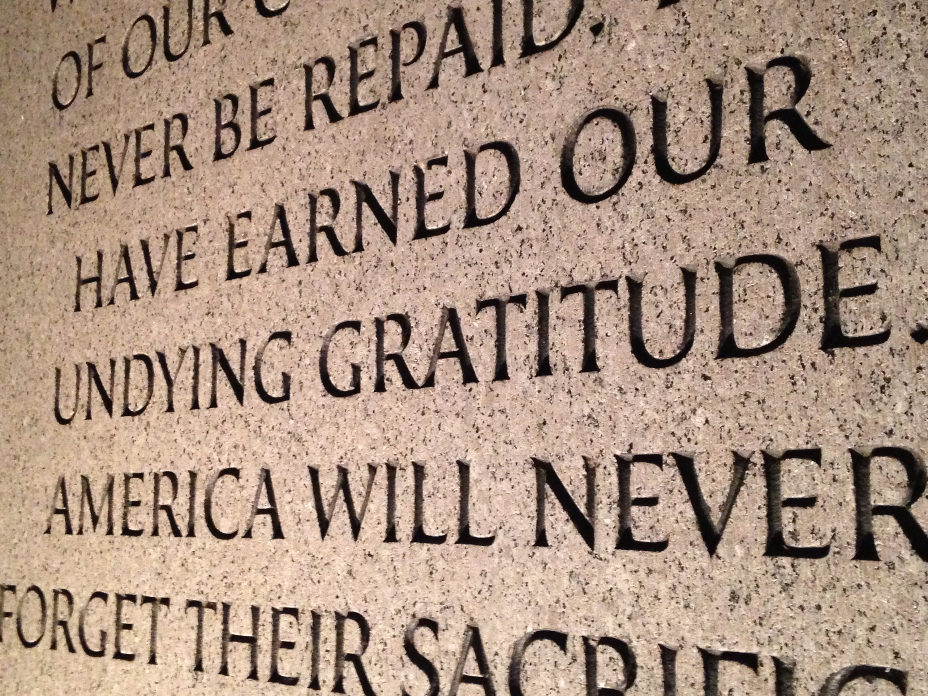 This is a shot of the words on the wall of the Lincoln Memorial. The words “undying gratitude” are the ones that stand out for me. I have a deep respect for those who went before us and fought the good fight…so we the future generation could have a better life.