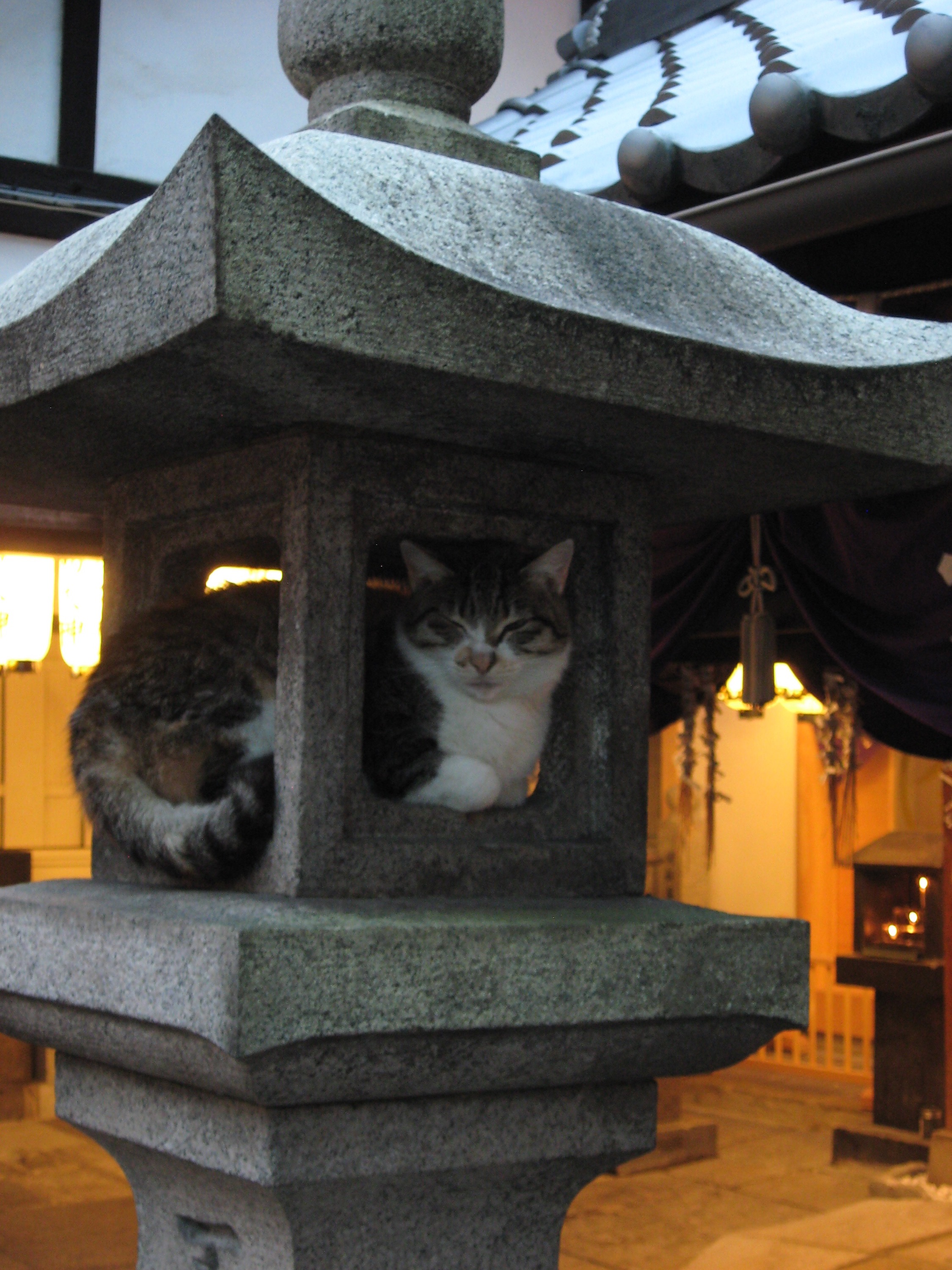 This cat was taking a nap. I have no idea how he got up into this shrine, but he looks quite at home here, as if he does it every day.