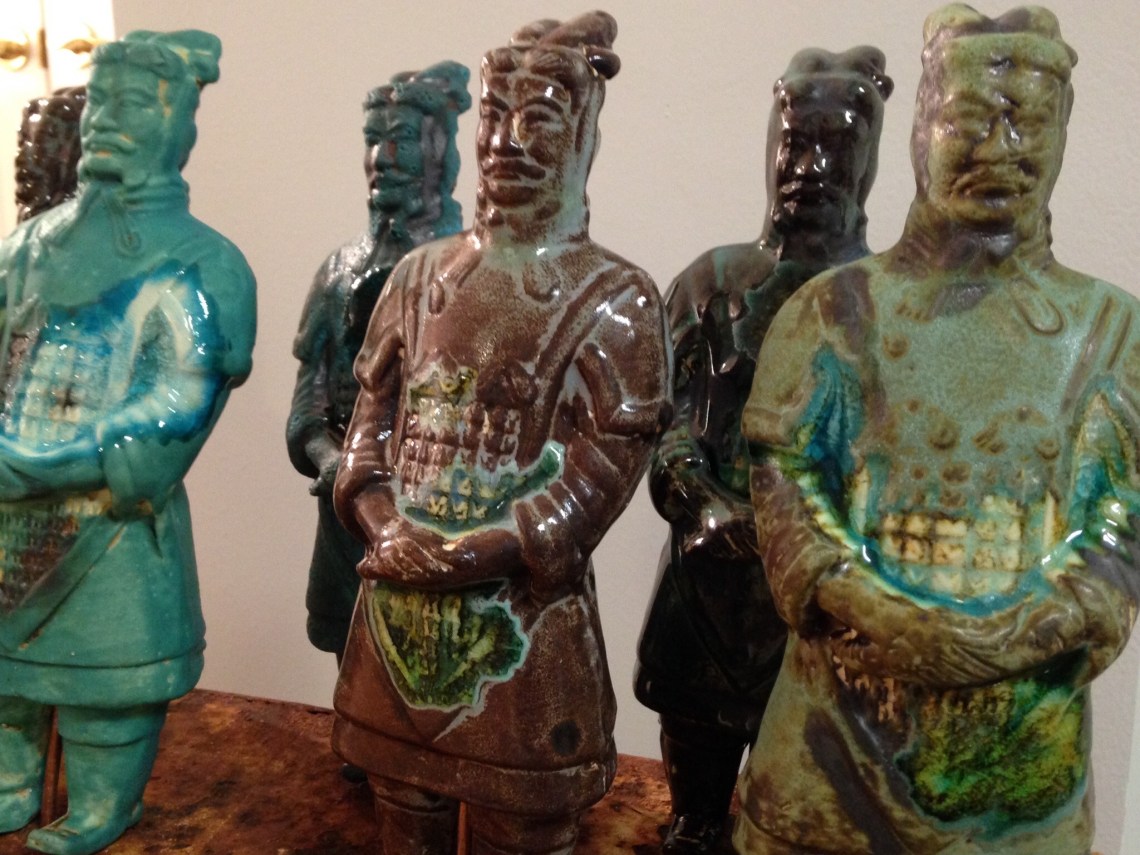 These are the unique creations of Phoebe Maze. She is a very talented clay artist from Waleska, GA. She purchased the mold for these soldiers in China, from the location where the original terracotta army was discovered. If you notice the sections of each soldier where there seems to be a bright spot in the glaze, that is where a piece of glass was included in the firing – the glass melted – and it created the unique look.