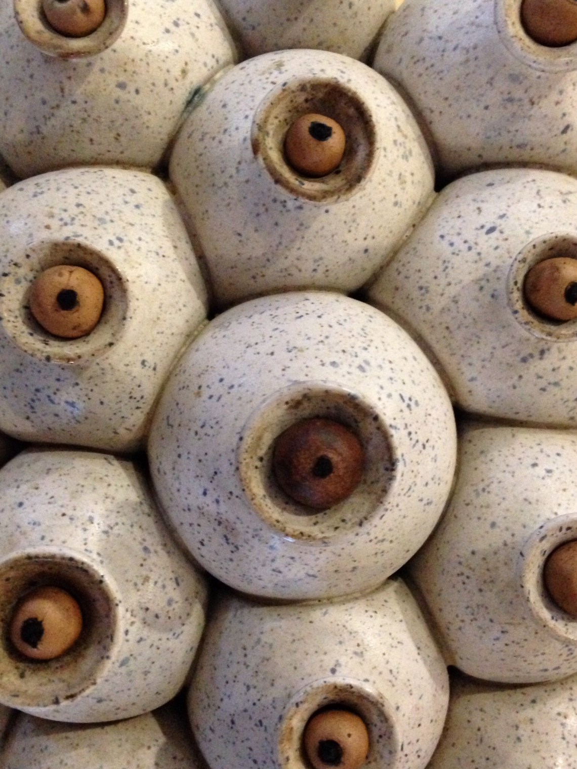 These oil lamps are part of a larger piece that includes 19 connected forms. It was created by clay artist Mary Murray (gordonmurrayisme@yahoo.com) in Brevard, NC. Each oil lamp was hand thrown on the wheel, then connected before they were fired. It was an anniversary gift for my Mom.
