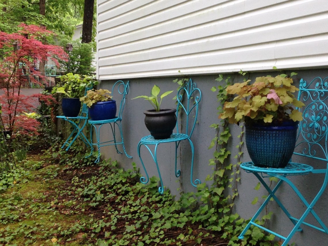 We have an ugly cement foundation around our home, so we hung chairs on it to disguise the blandness. First, we planted ivy as a ground cover to hide the lack of grass. I then found different metal chairs, painted them a bright blue, put a potted plant on each one – and whala! Ugly wall turned into display case for color and beauty.
