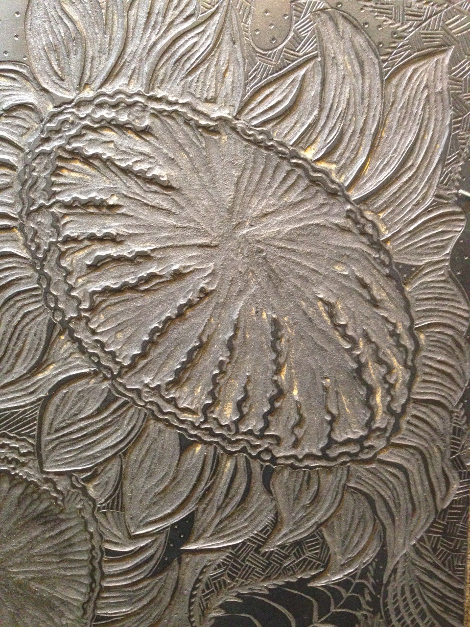 This is carved linoleum, it is used in printing. This artist, Oida Touchon (ouidatouchon.com), used the mums in her garden to inspire this block. Once she completed her carving, she covered it with inks and made a print. Sounds easy – sort of. The final print of this mum had four colors, which meant she created four different versions of this block – one for each color. She created a registry mark to make sure her four blocks aligned at the same point, thus ensuring her print would be consistent.