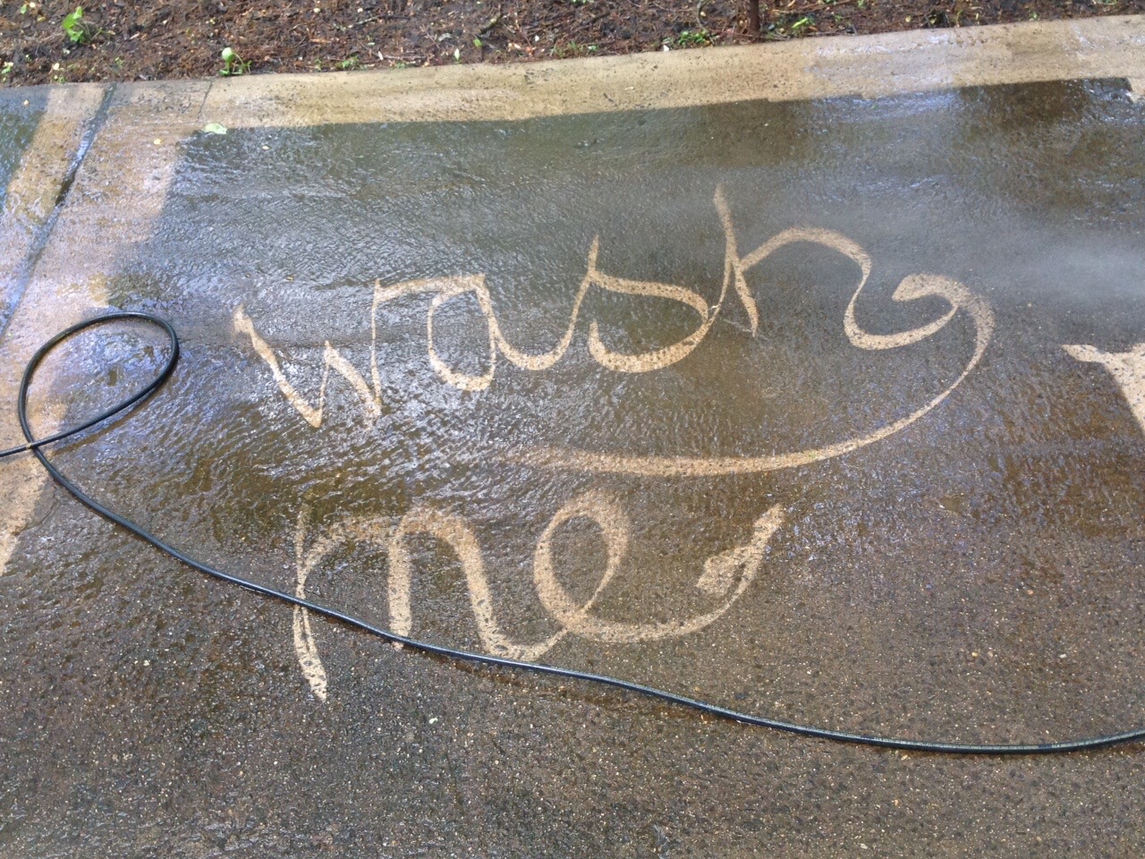 You’ve seen this written on dirty car windows and dusty tractor trailers. I wrote it on our driveway as I was power washing. Any excuse to practice writing letters.