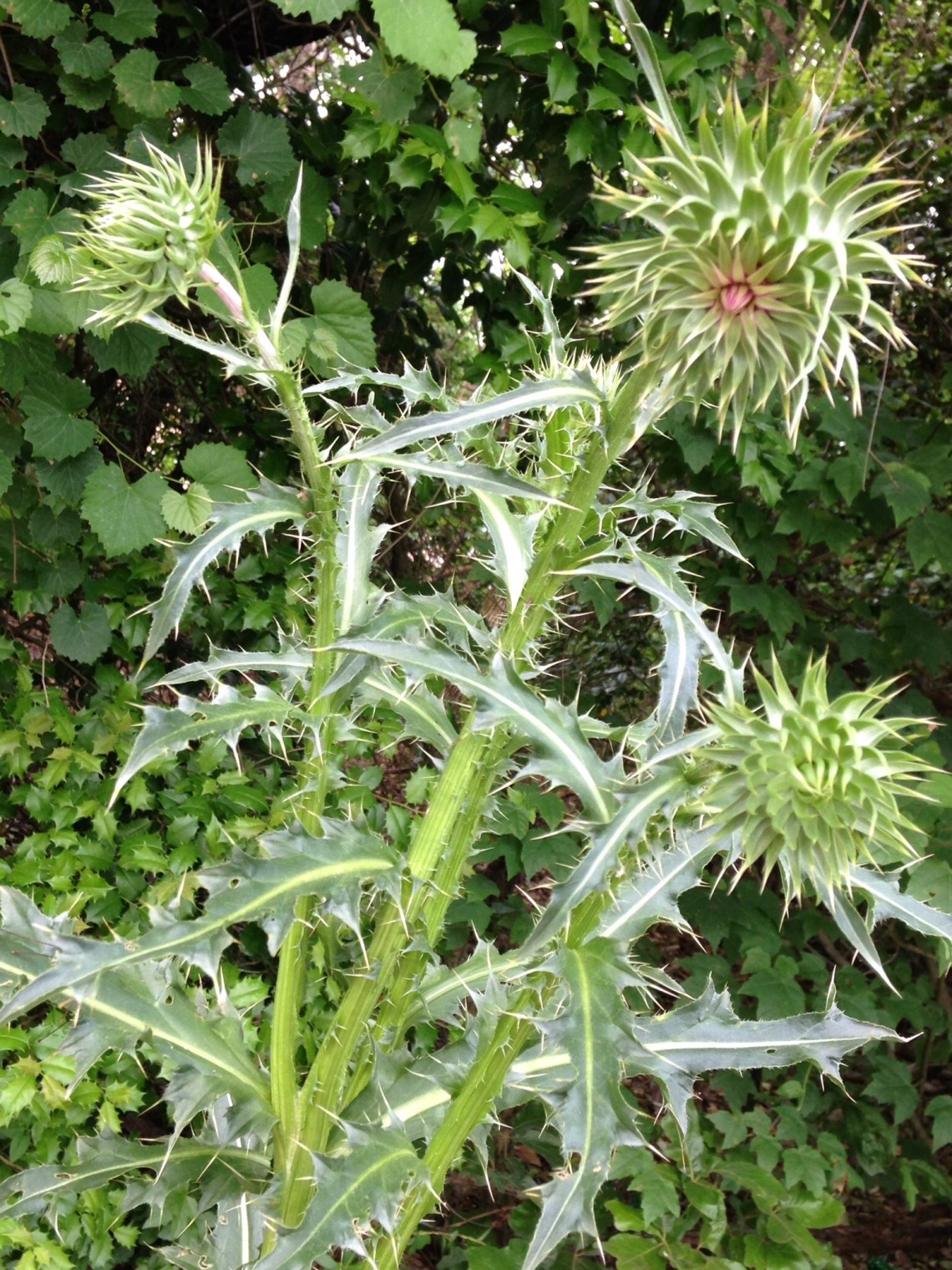 I saw this plant on the side of the road during one of my walks. To me it screamed, “STAY AWAY!” The thorns, the prickers on the stem, the spines on the blooms, everything about this plant let me know it did not want me around.