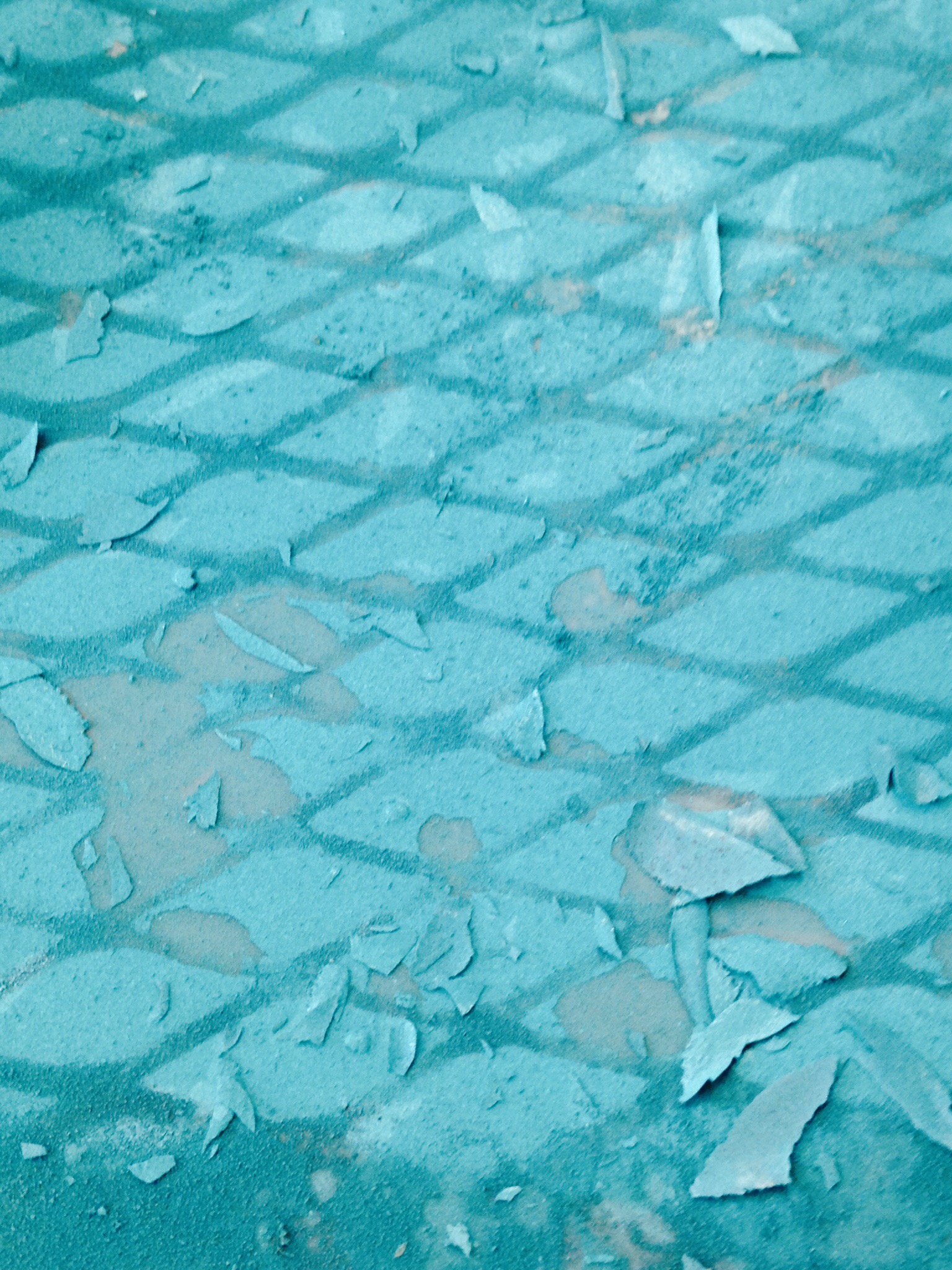 I spent last weekend refinishing patio furniture – fifteen pieces. I spray painted it all in our garage. It turned out great, but I made a huge mess. I covered the center portion of the floor with a drop cloth…this is a picture of what it looked like before I cleaned up. I liked the shades and textures that were created as I painted layer upon layer of paint, working diligently to get even coverage across all the different surfaces.