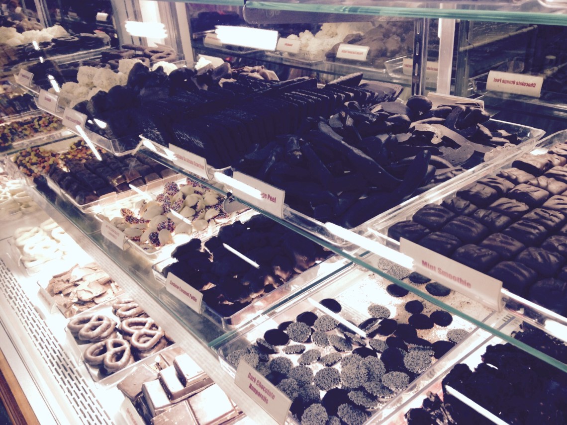 Chocolate, choclolate and more chocolate. I find that people either love it, or simply enjoy it from time to time. When I saw this case full of fudge, handmade white chocolates, and chocolate covered one-thing-or-another…it made me think about all the different ways people enjoy chocolate – desserts, drinks, candy, chocolate covered pretzels…or even just simple chocolate bars. There is another side of chocolate – sugar, calories, cost, and caffeine. You know what you aregetting when you bite that dark or milk chocolate bar.