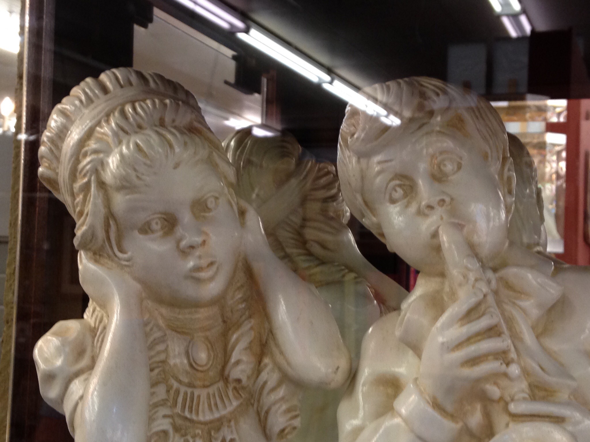 Believe it or not, I saw these two figurines for sale in an antique shop. They made me laugh. He seems to be very passionate about playing the saxophone, and she looks like his playing is actually painful; her ears are burning or ready to explode. So why did someone make these? What were they trying to illustrate? And can you imagine putting them on your shelves to view and admire on a regular basis?
