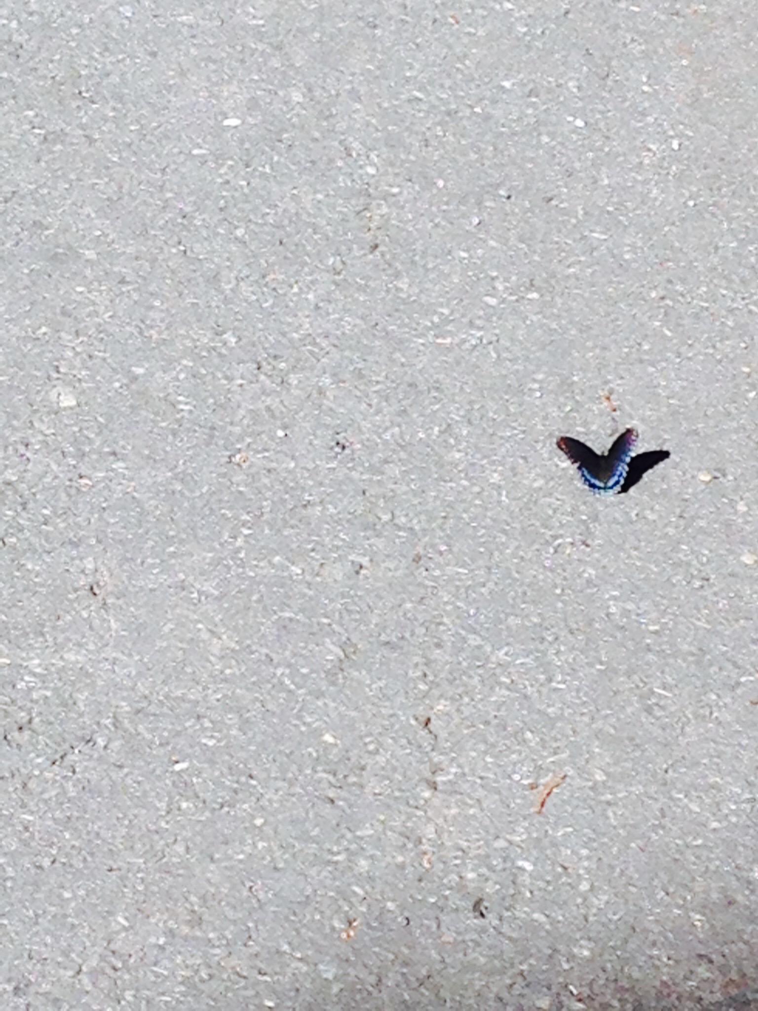 As I walked this morning, I was trying to clear my thoughts of all the things I needed to accomplish. That list seemed long and a bit overbearing. As I traveled, I saw this butterfly on the road. Just sitting there, warming itself in the sunshine. No goal, no worries, just resting on the warm pavement.