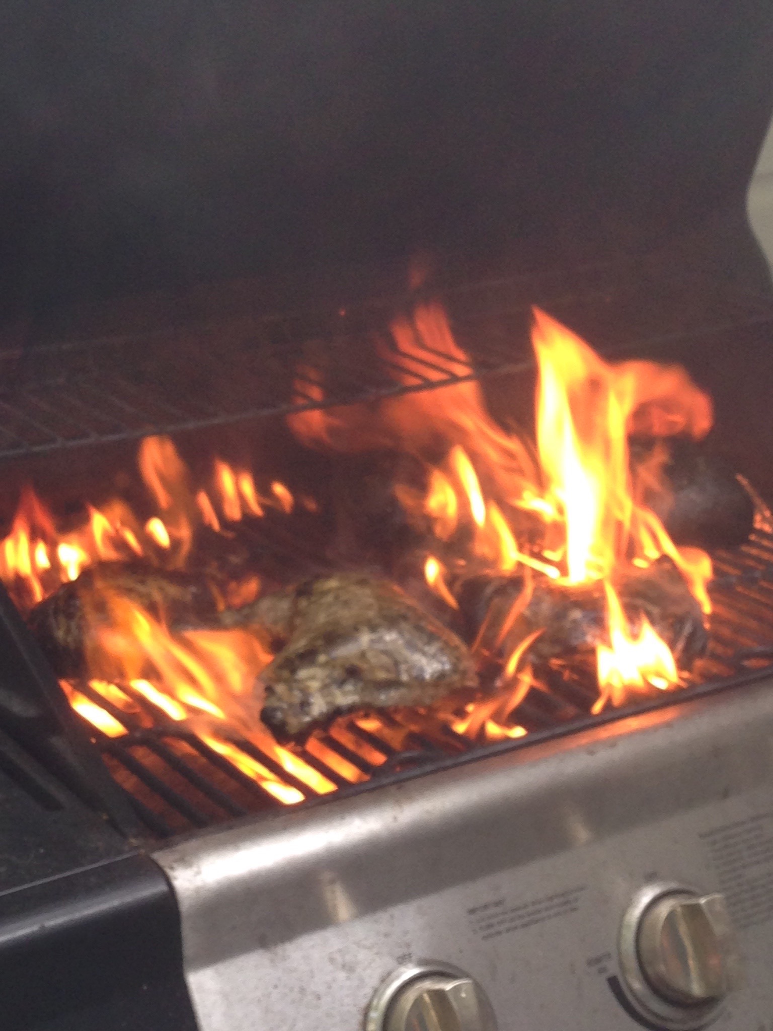 This was our dinner – I say was because as you can guess, we ended up not eating it. My husband put these four chicken quarters on the grill, and within minutes this is what happened. Kaboom! Three foot high flames, and no chicken for dinner. At first my husband was REALLY mad, he had a taste for grilled chicken. Once we contained the fire, we laughed…then said, “I guess we’re having pizza!”