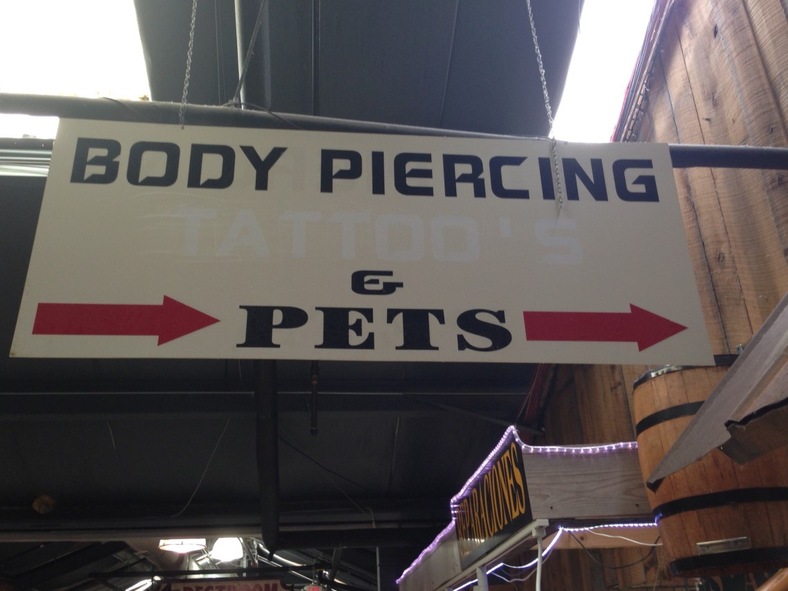 My husband and I love a good flea market. You never know what you are going to find…as this sign indicates. We actually went down this aisle and found just what the sign advertised – body piercing booths, then cute cuddly puppies, kittens and bunnies. Not a combinaiton I would have expected.