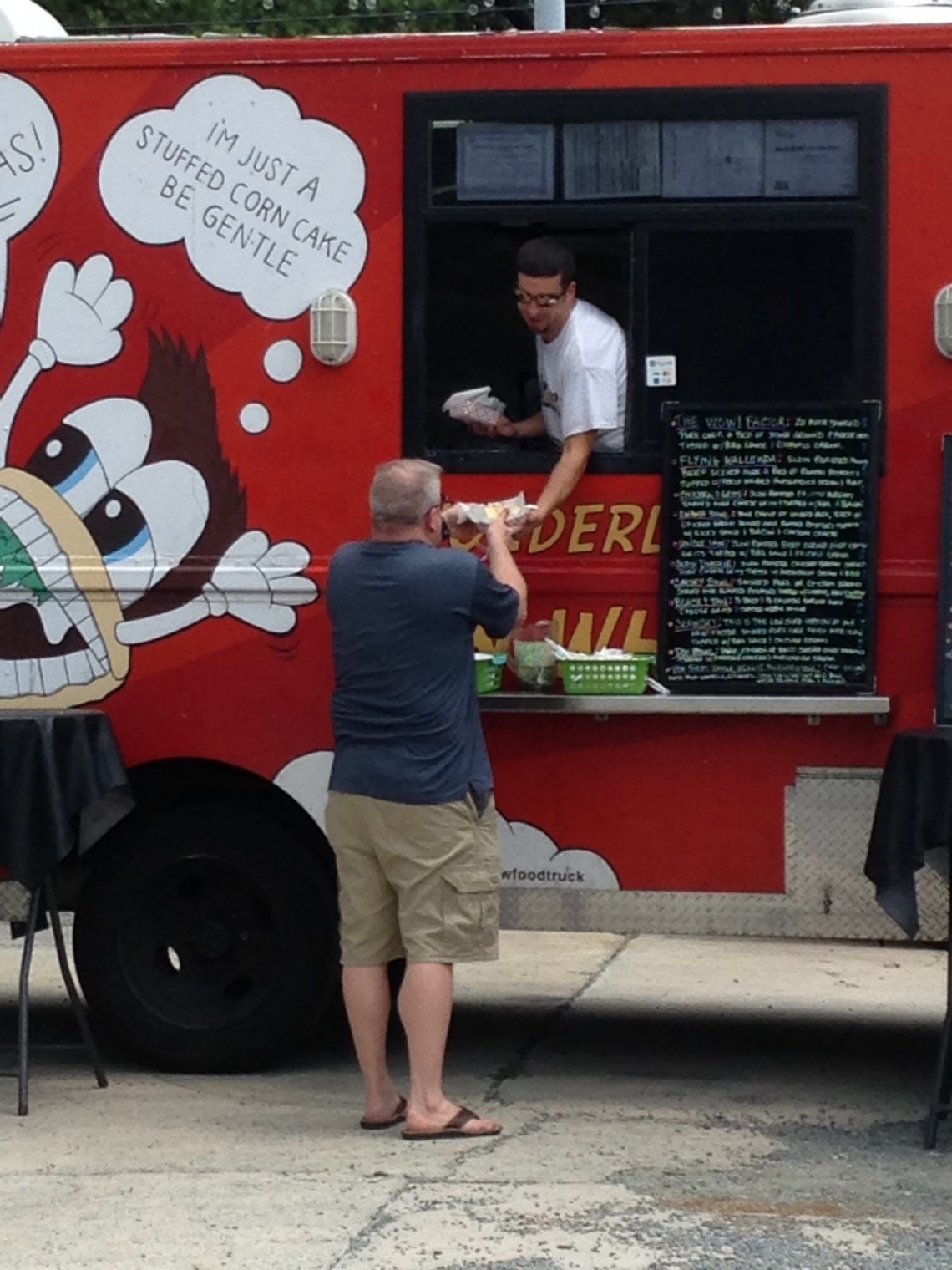 We enjoy Food Trucks – the variety, the food, the items we can’t get anywhere else. It’s a great concept. Atlanta has a food truck park, and when we are downtown we try and visit to see who is serving what. Here my husband is being served his pulled pork with grits and corn cakes with chicken. He said it was subblime!