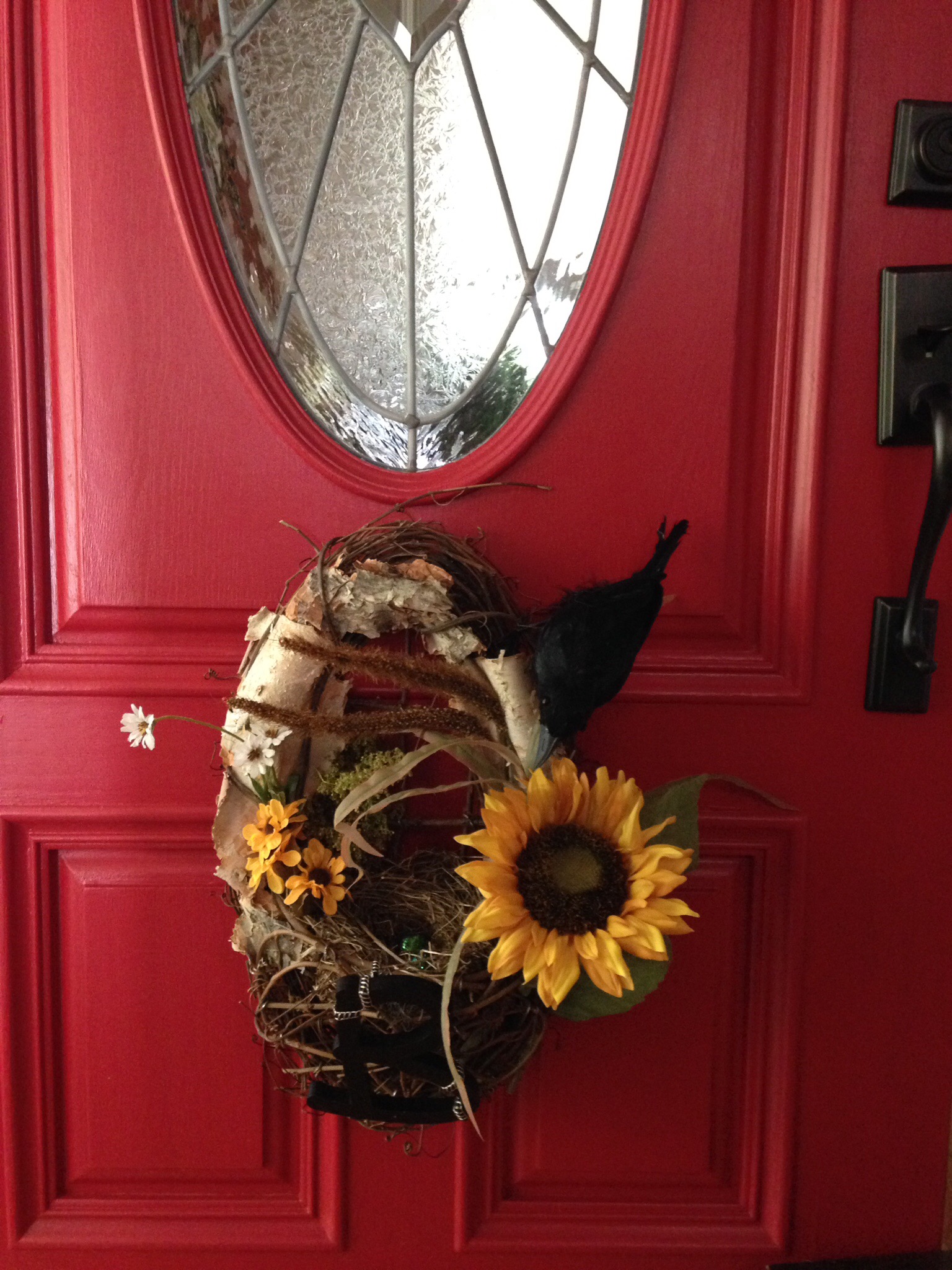 No matter the talent or creation, I am constantly amazed at what people are able to produce with simple elements. My friend Sandra Barlow (sandibar02@yahoo.com – Birds of My Heart) created this wreath out of a bird’s nest she found in the forest near her house, a sunflower, and Sweet Annie she grew in her garden. At our request she included birch bark and a crow.