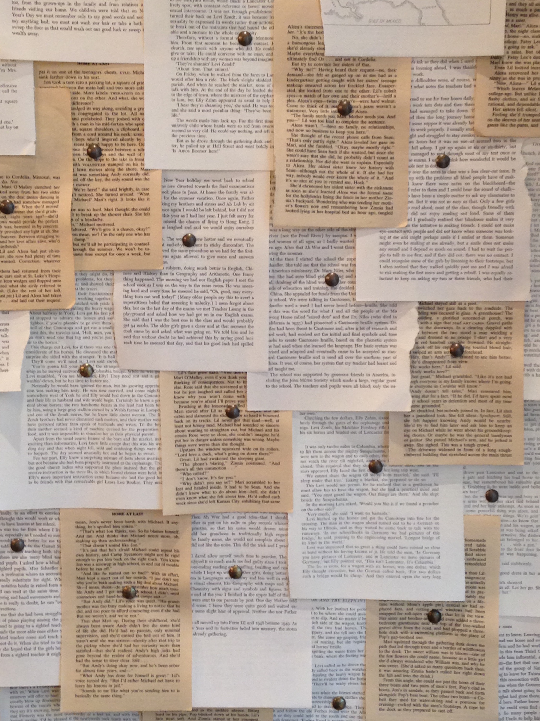I love the written word, reading, literature and all types of storytelling. We recently shopped in a store that had this covering the walls. They simply took pages from books and put them on the wall with one brass tack…how cool is that?