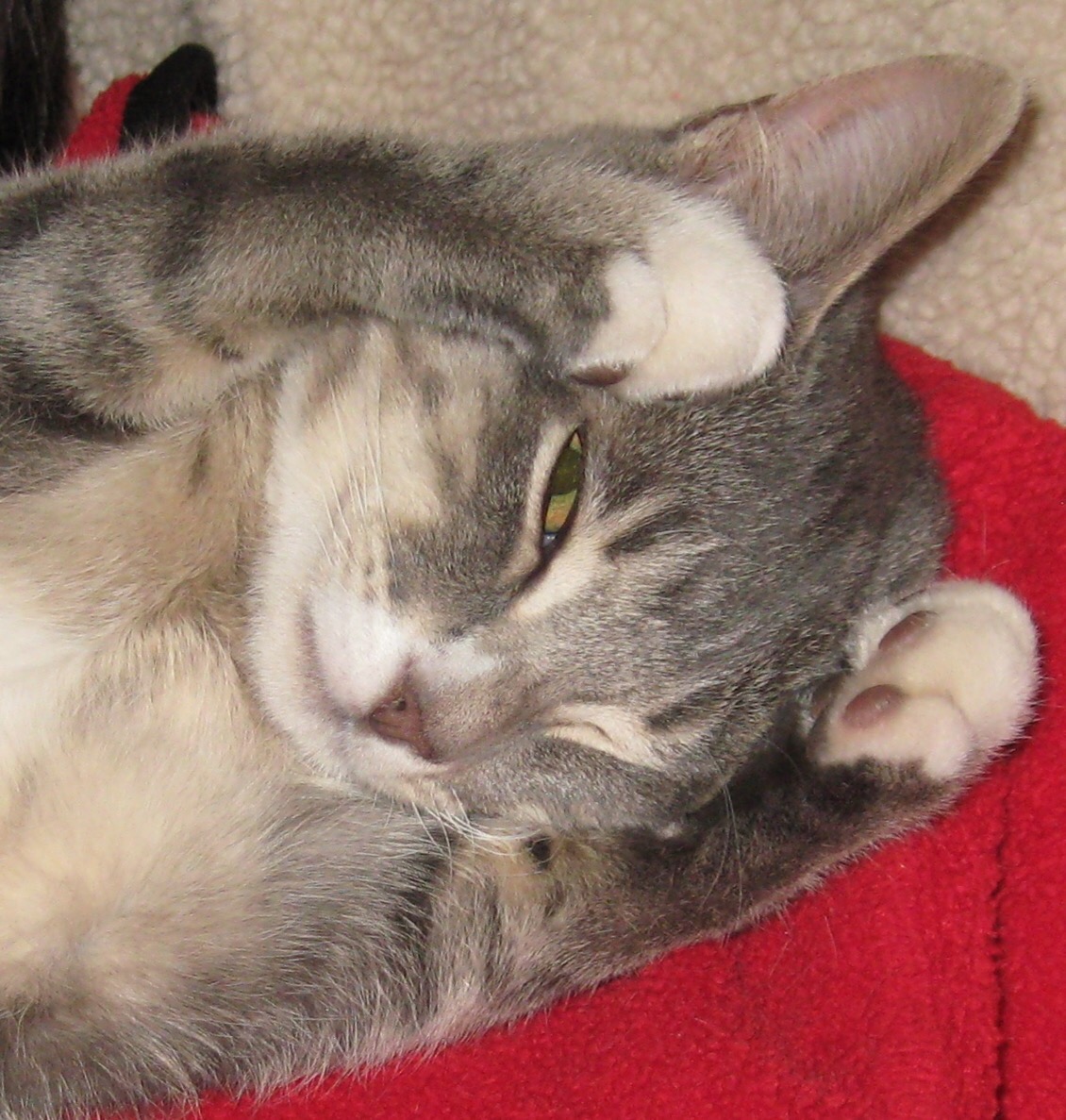 “Please stop annoying me – I am trying to sleep here!”…that’s what I see here on Artie’s face as I take yet another photo of him sleeping. I think the paws over his eyes are the dead give away. By the way, he did go back to sleep once we left him alone.