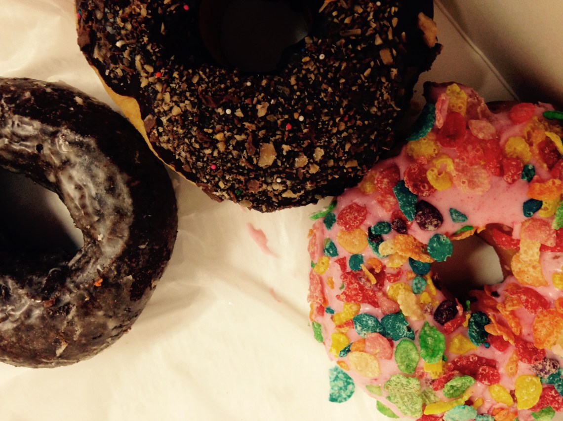 Some days ya’ just need a donut…and on this particular day, the donuts were incredible! The pink one – a sugar covered circle covered with Fruitie Pebbles cereal – crunch, sweet, yum! Just looking into the box made me feel decadent and defiant…ans my blood sugar jump off teh charts.
