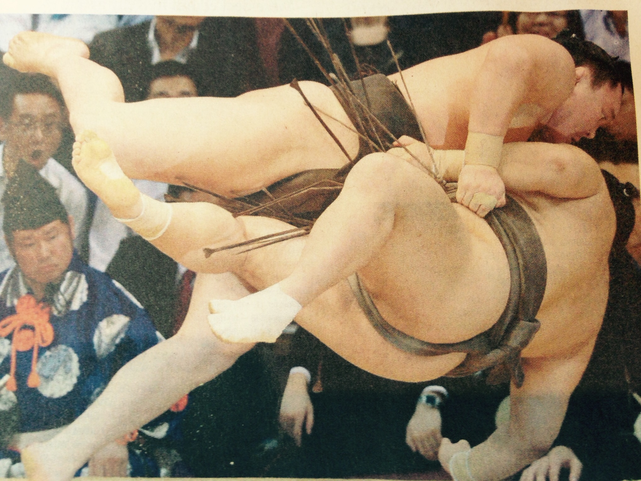 I am a HUGE sumo wrestling fan – no pun intended. It is sumo season this month, which means for fourteen days there are matches taking place. This was the cover story in the sports world in Japan this week. This is a shot of the champion taking his opponent down with a move that has not been seen in five years. The champion was able to flip his opponent by using his own weight against him. When I saw this I got excited, like the crowd member in the upper left corner of the picture. Check out his face…he looks exactly how I felt when I saw the replay on the news…unbelievable!