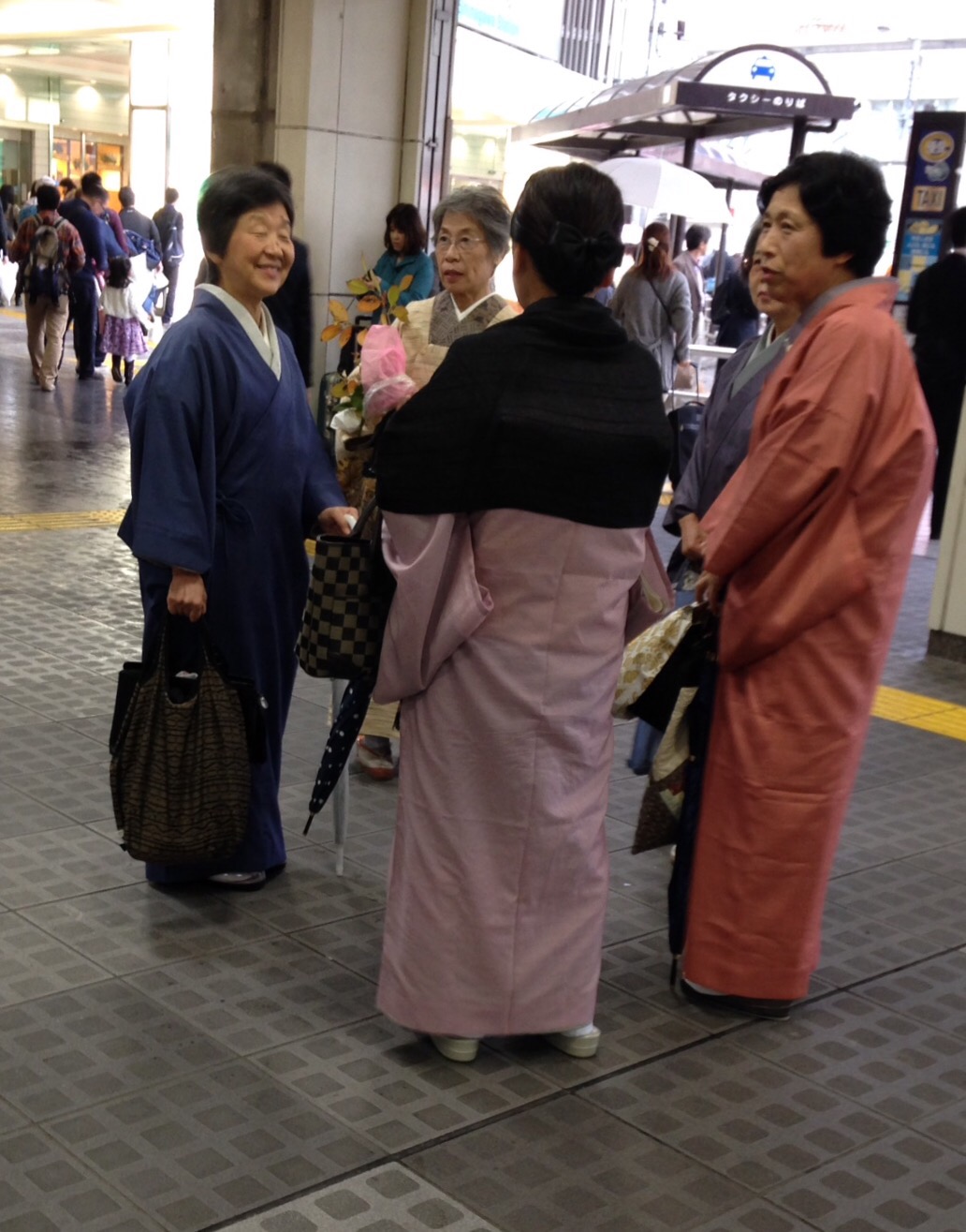 These lovely ladies are waiting for a train at Shinigawa station in Tokyo. What I enjoyed watching was the way they greeted each other as one by one they arrived at thier meeting point. They were happy to see each other, bowed deeply, and smiled…then began sharing. They talked freely and passionately, and seemed to be glad to be together. I know you have noticed that they are all in traditional dress, with beautiful coats covering their kimono…friendship is universal isn’t it!?!