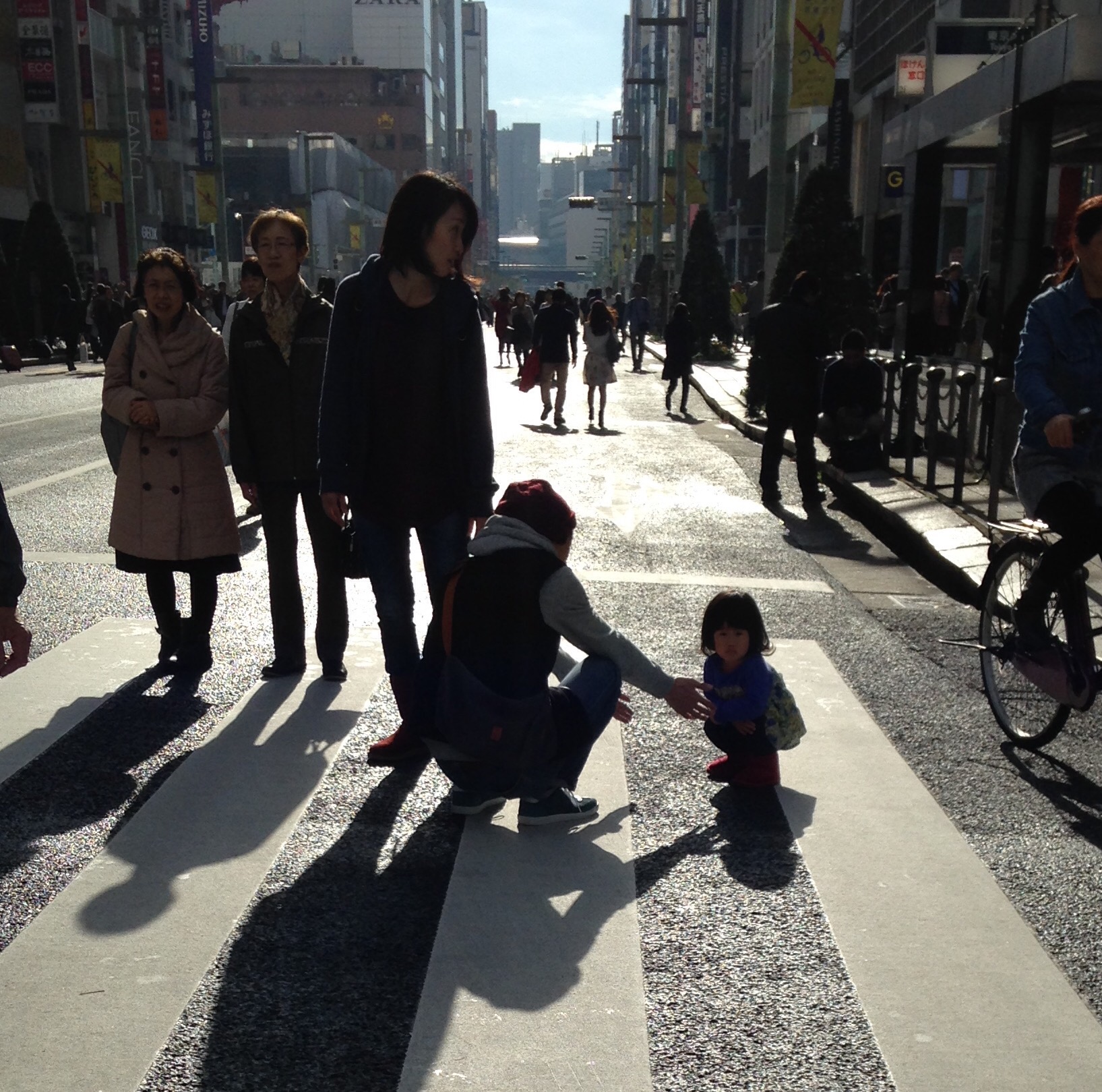 It is Sunday afternoon on the Ginza in Tokyo, which means they close the streets for the people to walk down the center and enjoy the day…but this little girl has had enough. She stopped in the middle of the cross walk and just deicded she was done. She wanted no more and simply stopped. Here you see her Daddy trying to coax her into moving forward…from the look on her face, I think he is in for quite a battle.