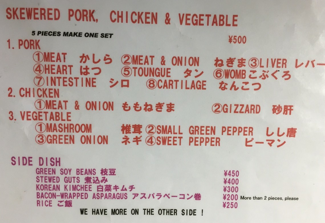 I’ll give you a minute to read the menu, the entire menu. Check out the second option under the Side Dish selections…stewed guts. When we were eating at this particular Yakatori restaurant in Tokyo, the waitress brought us a bowl of stewed guts because my nephew ordered intestine, womb, and tongue…she figured he would like stewed guts. He did. I did not eat the stewed guts, I stuck with chicken and beef. I enjoyed watching everyone else eat them, and then they could tell me what else they were going to consume.
