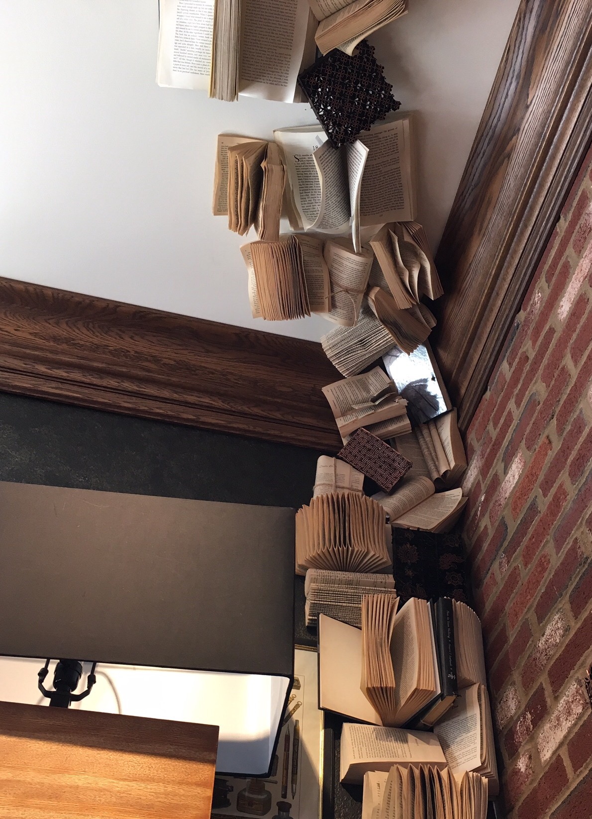 You are not seeing things, these books are climbing over the bookshelf and onto the ceiling of this furniture store. A very clever designer attached them to the wall and ceiling with pages open, turned, and wrinkled. It added great interst to the bookshelf display. Don’t believe me? When was the last time something in a store made you stop and look all across the ceiling? This one worked for me.