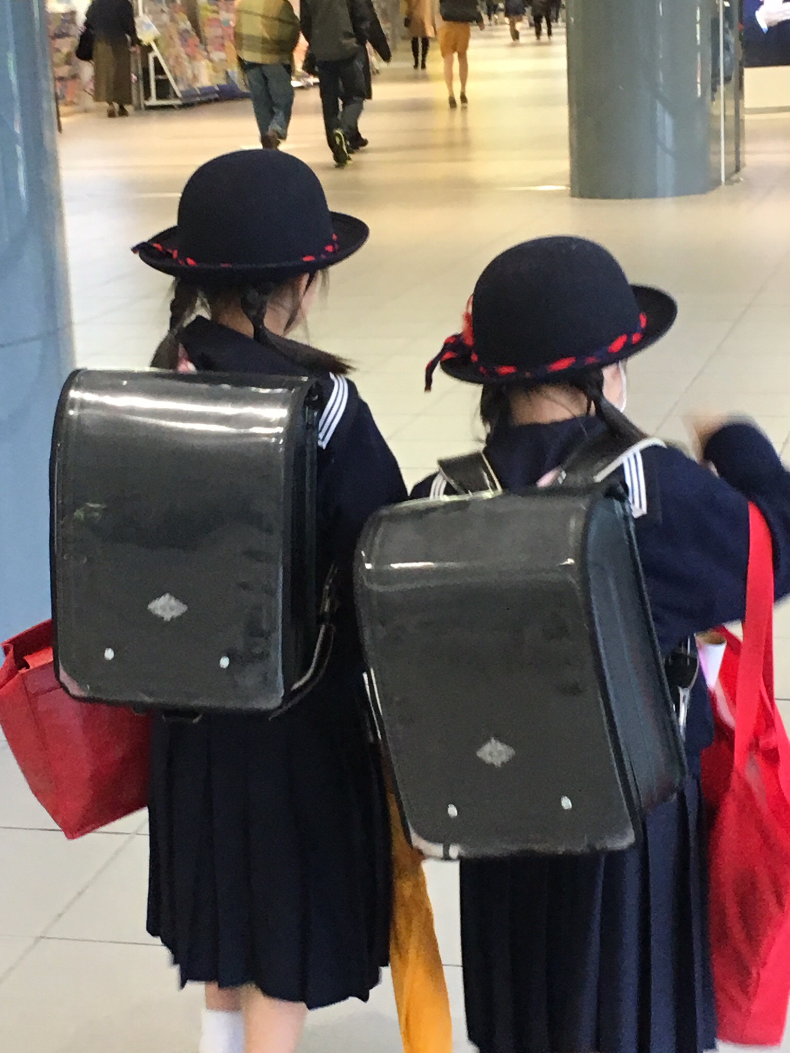 These adorable Japanese young girls are on their way to school. Between their uniforms and their book bags, umbrellas and hats…they are ready for a busy day. They take the train each morning, then take it home again as well…no car pools, no school bus, just a trip on public transportation. You will see lots of students on the train in the mornings…you can identify them by their uniforms.
