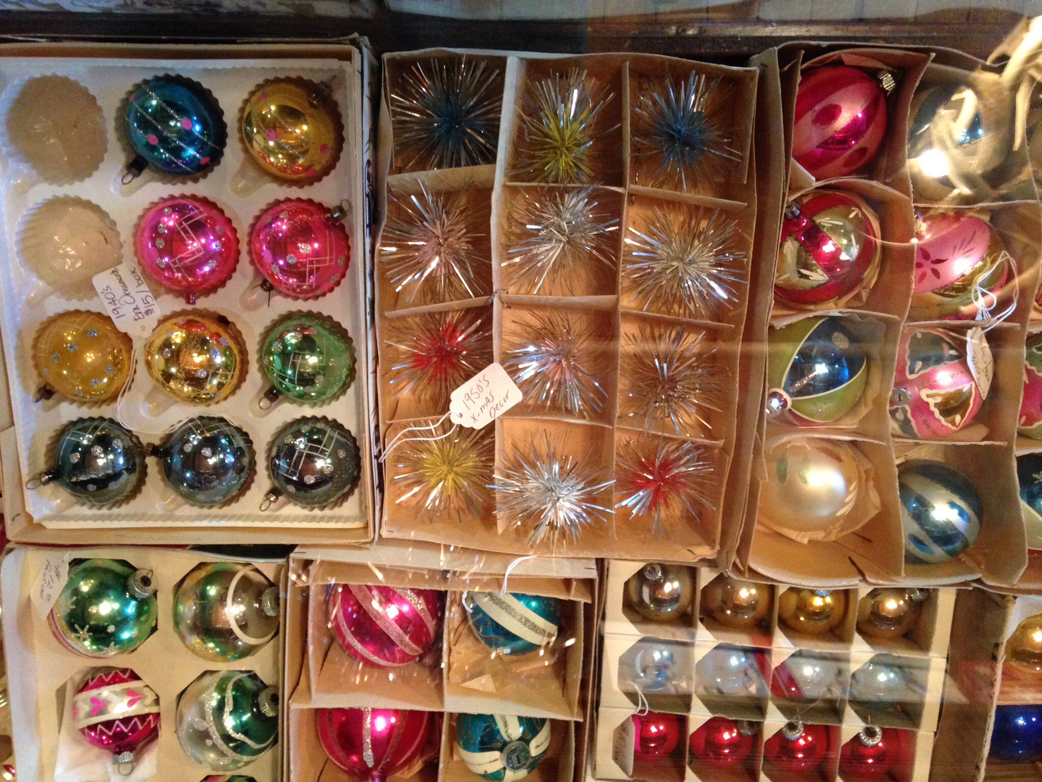 We found this display of 1950s Chrsitmas decorations and they brought back fond memories of childhood holiday trees. For my husband’s Italian grandmother, these were the decorations of choice. We still have a couple boxes of her decorations like these in our attic. It’s amazing that something so small and delicate can hold the key to cherished childhood memories.