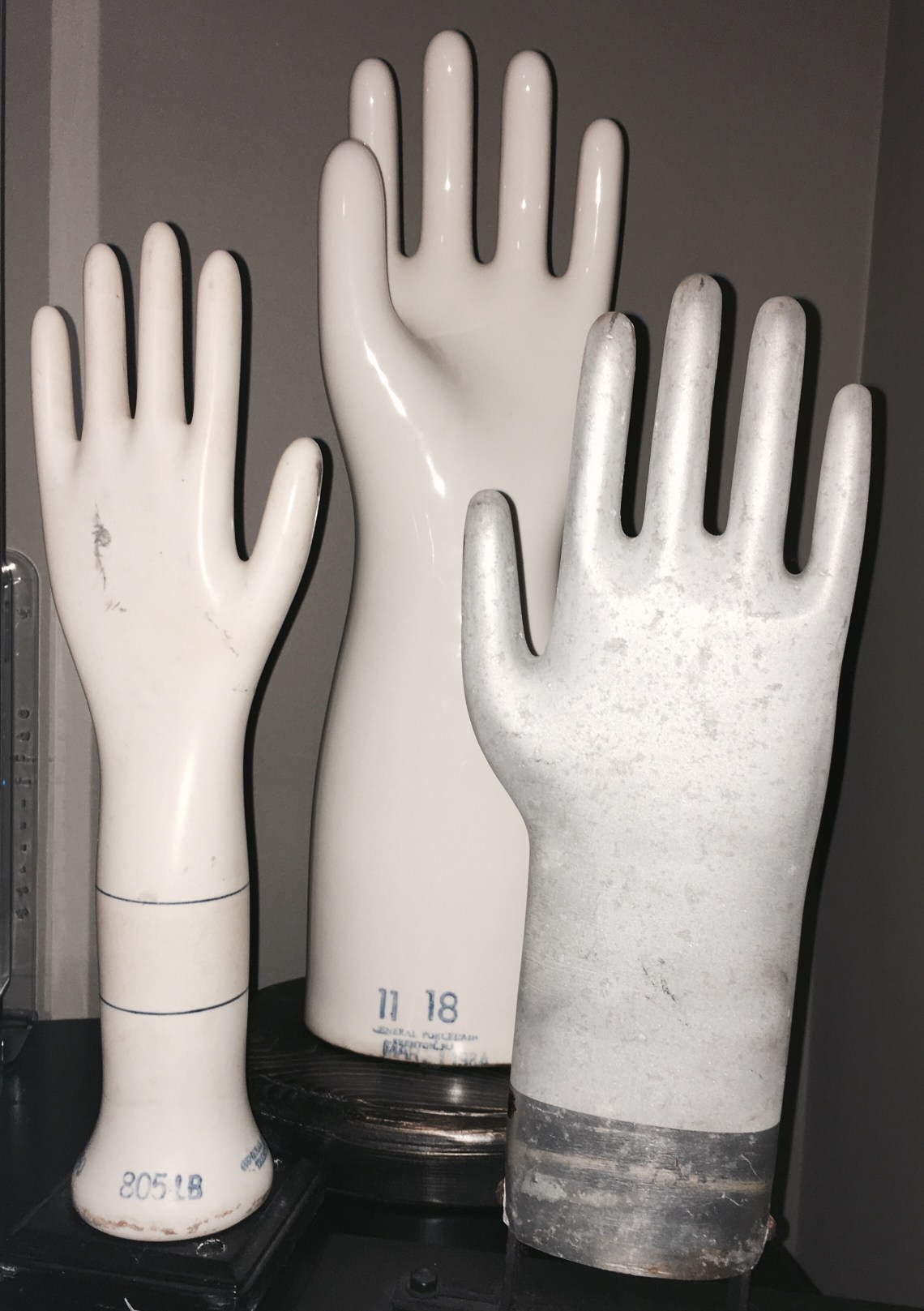 I have these three porcelain hand molds in my office. They are the molds that were utilized to create synthetic gloves for industrial and household use. They would have been dipped into latex to create one glove at a time. They sit on a cabinet right in front of my desk, so I can see them everyday. I like that they are all different and were created to help manufacture different types of gloves.
