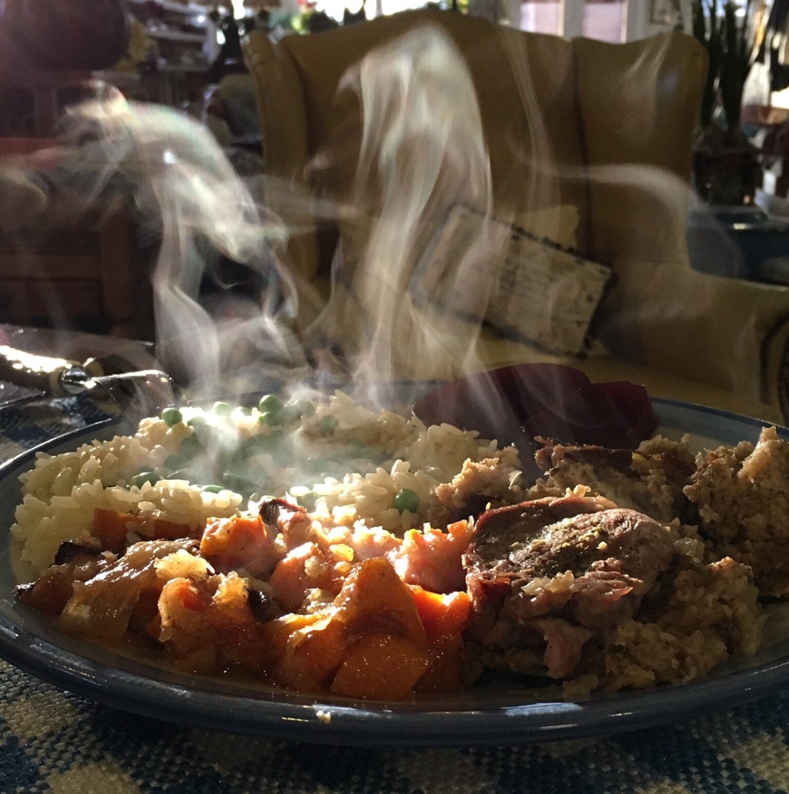 When it is cold outside, what a blessing it is to have a hot meal. For Sunday dinner we usually eat at my parent’s house; this photo shows last night’s meal. It was wonderful. My Mom is a great cook on top of being a warm and loving hostess. Even if we decide to order Chinese food or eat something light like a salad, the best part of the meal is not the food but the fellowship. It is a great chance to just chat about things, talk with each other and share the love of family.