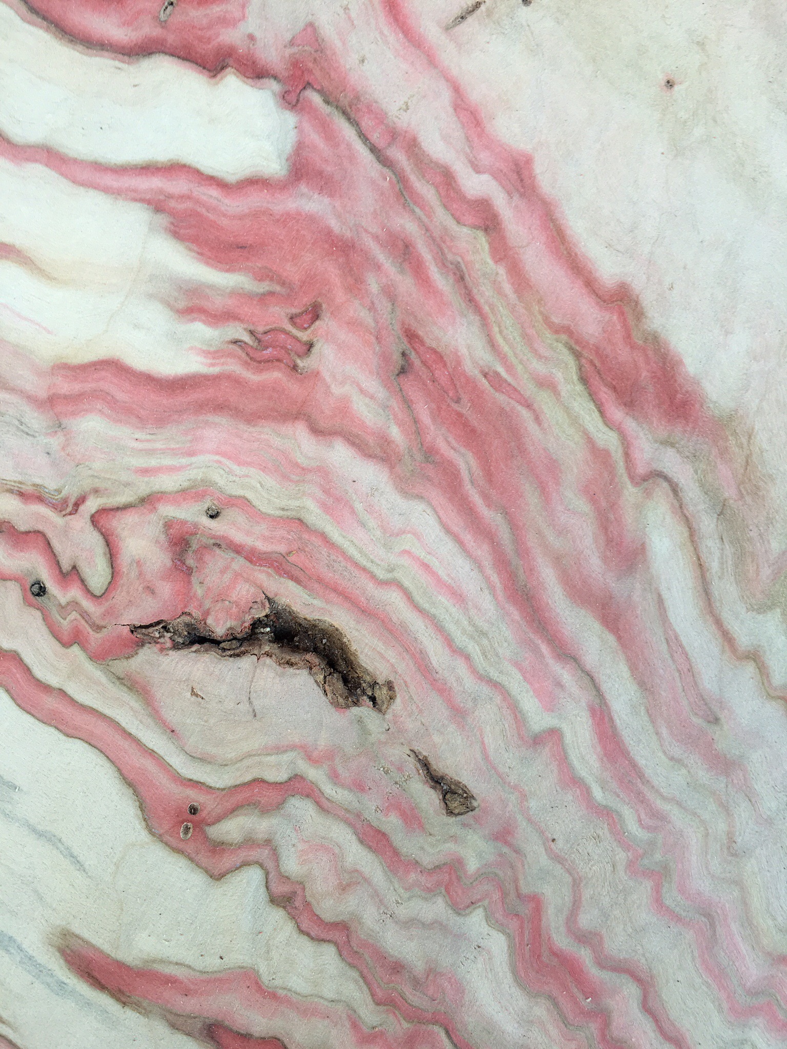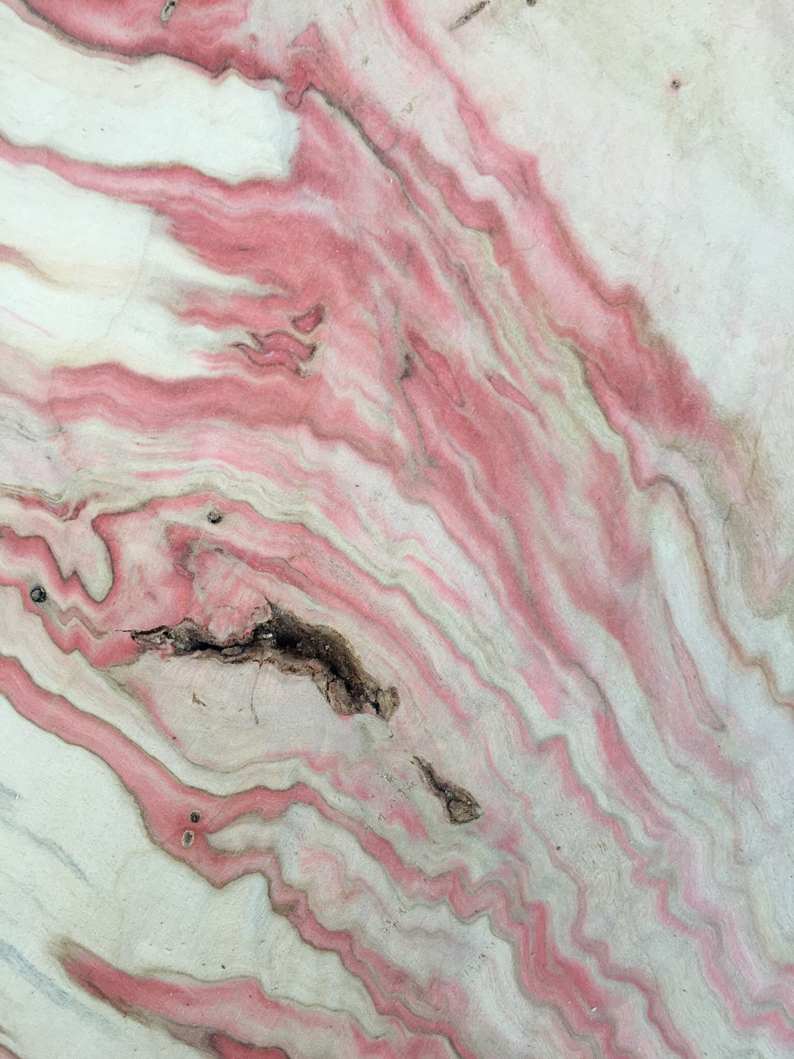 This is a close up of a piece of Box Elder wood. This particular piece of wood had a virus. How can you tell? The color in the wood is a natural reaction to the tree working to fend off the virus. So the Red is what happened when the tree worked to protect itself. What a beautiful result of a terrible infection.