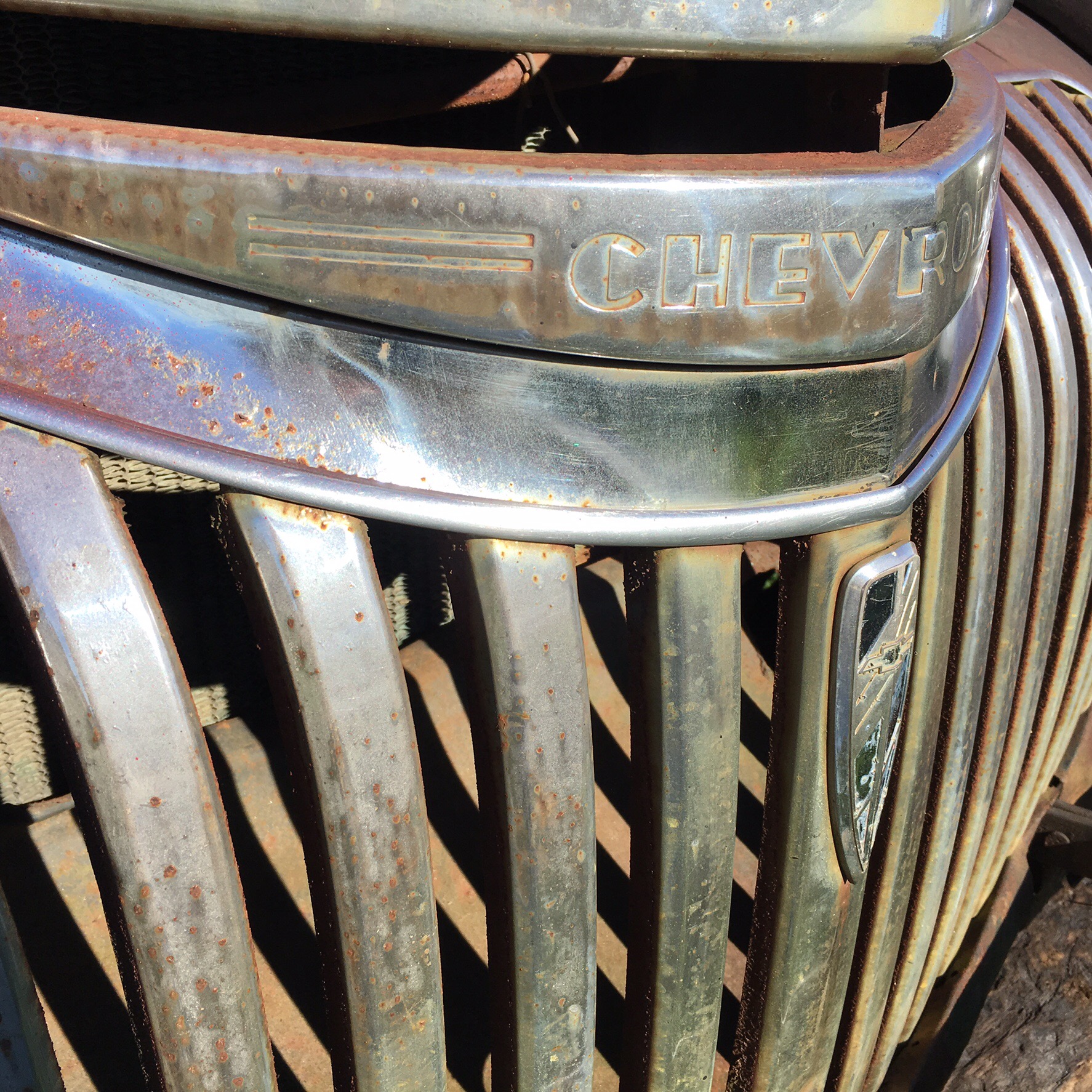This is the grill from a 1940s-ish Chevrolet pick up truck…rusted, broken, and full of beauty. It is my husband’s dream vehicle. We found this one outside our favorite barbeque restaurant. It is a great vintage find and actually made my husband drool.