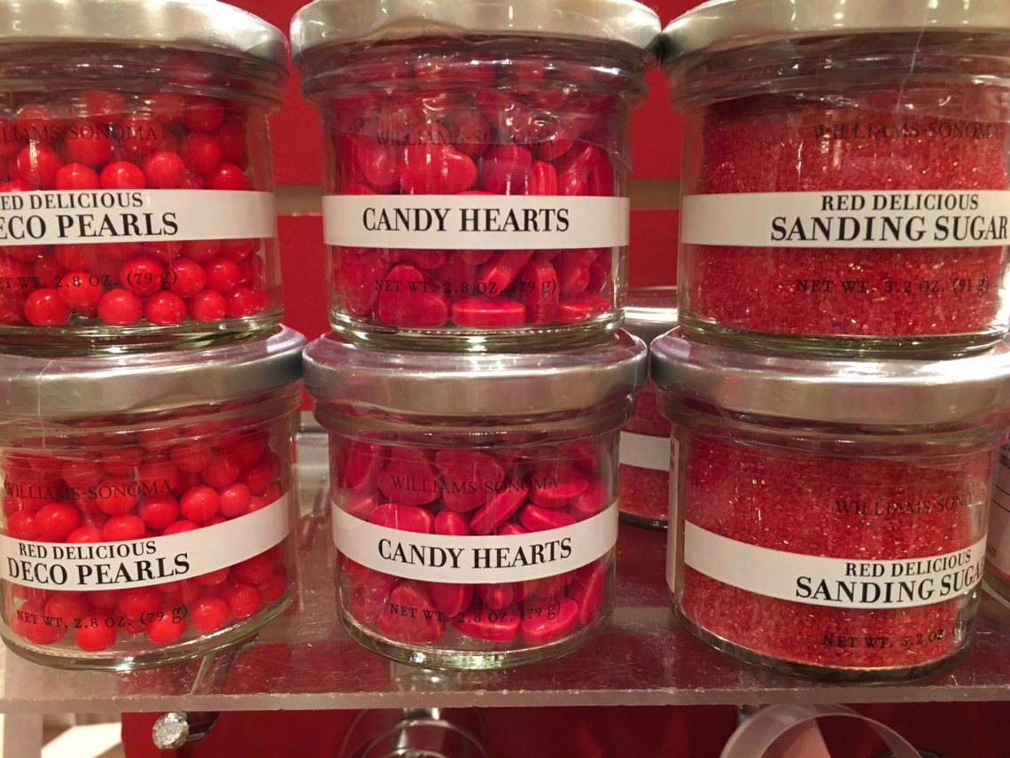 We are a couple weeks away from Valentine’s Day. In a cooking shop I saw these candy toppings for cookies and cupcakes, and it made me think about marketing. Someone packaged, labeled, and designed the display for these holiday specific toppings…any other time of the year they would just be red candy. These are being packaged and sold to make the purchaser feel special, unique, and that they are buying something that will make whatever they make more valentinesie.
