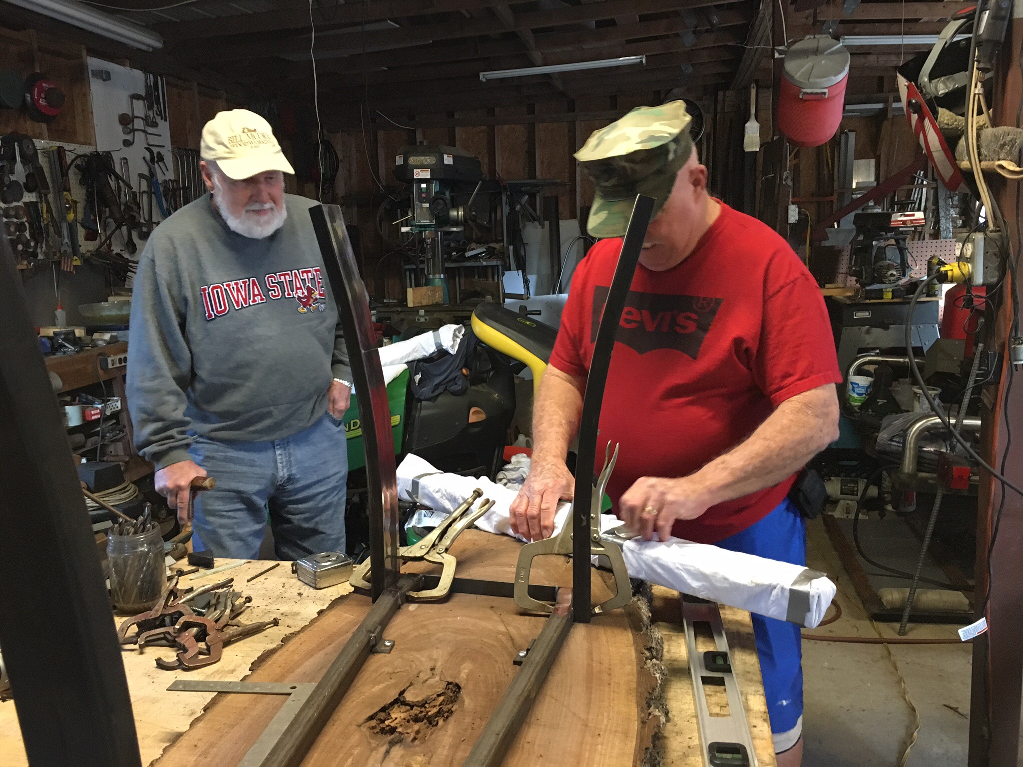Here you see two very creative men who both love their craft. My Dad, Bill Moore is on the left (Go Iowa State!) and Dave Taylor is on the right. Here you see them working on the legs for one of Dad’s tables. Dad draws what he wants, and Dave fabricates it. Dave teaches welding at Chattahoochee Technical College in Jasper, Ga. Both men are passionate about what they do…and neither wants to do what the other one does. They don’t compete with each other, they complete each other.