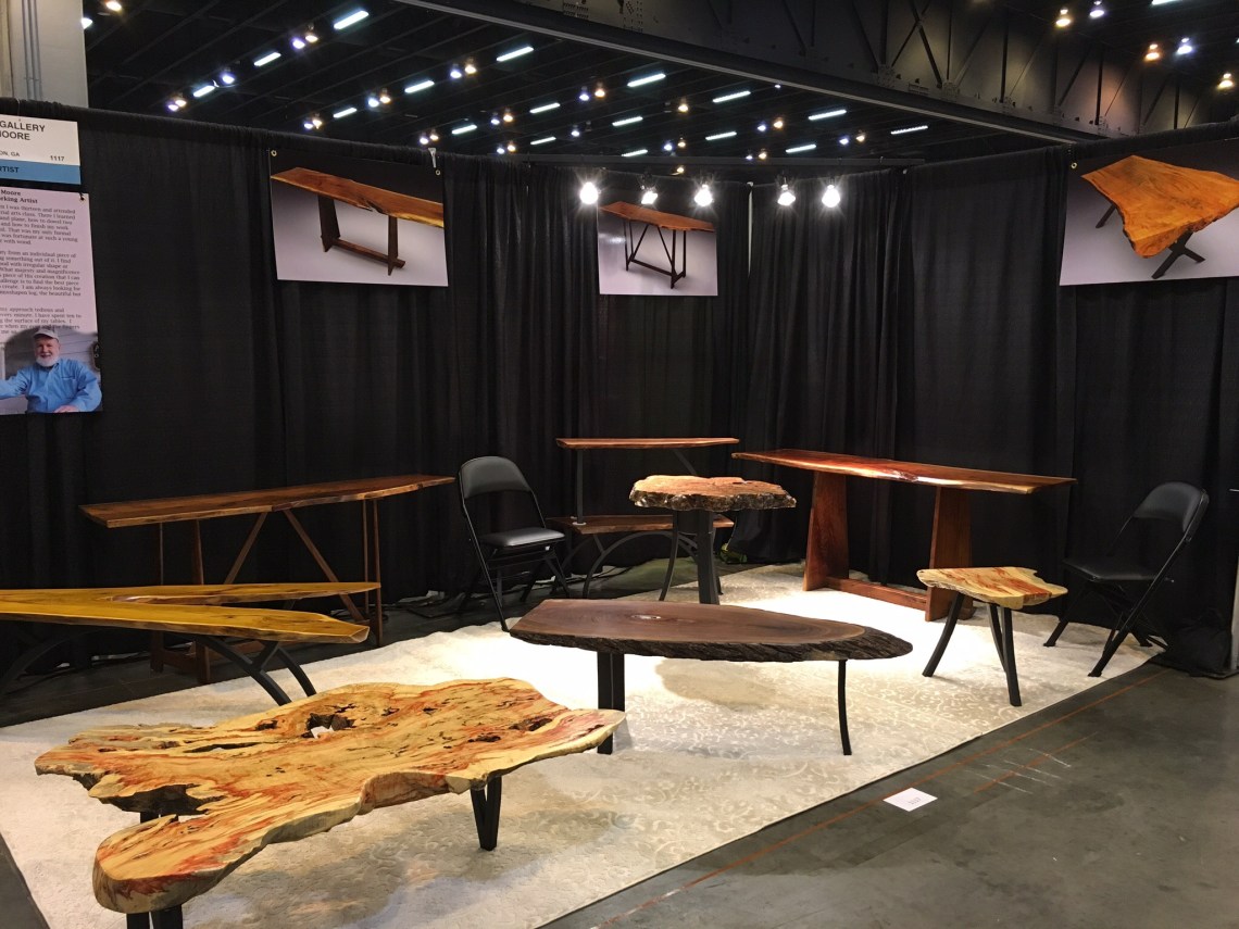 The booth is set up. The furniture has been polished. The price tags are ready for customers. The sales software is ready and waiting to process all the forms of payment. This is my Dad’s booth – Bill Moore, booth 1117 – The American Craft Council Show (#ACCAtlanta). We set up today at the Cobb Galleria in Atlanta, GA.