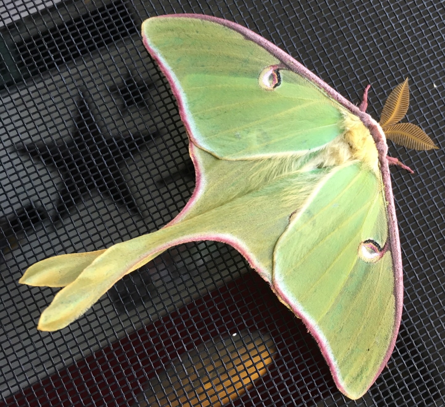 Spring means the bugs come out. Here is our first Luna Moth of the season. The wings almost look as if they are furry. And the pink dots look as if they could be winking eyes. They only fly at night, and do not have a mouth…so adult Luna Moths only live about a week. This beauty shows up, flys for a short time then dies…all the effort of transforming from caterpillar into a moth to live for only a week.