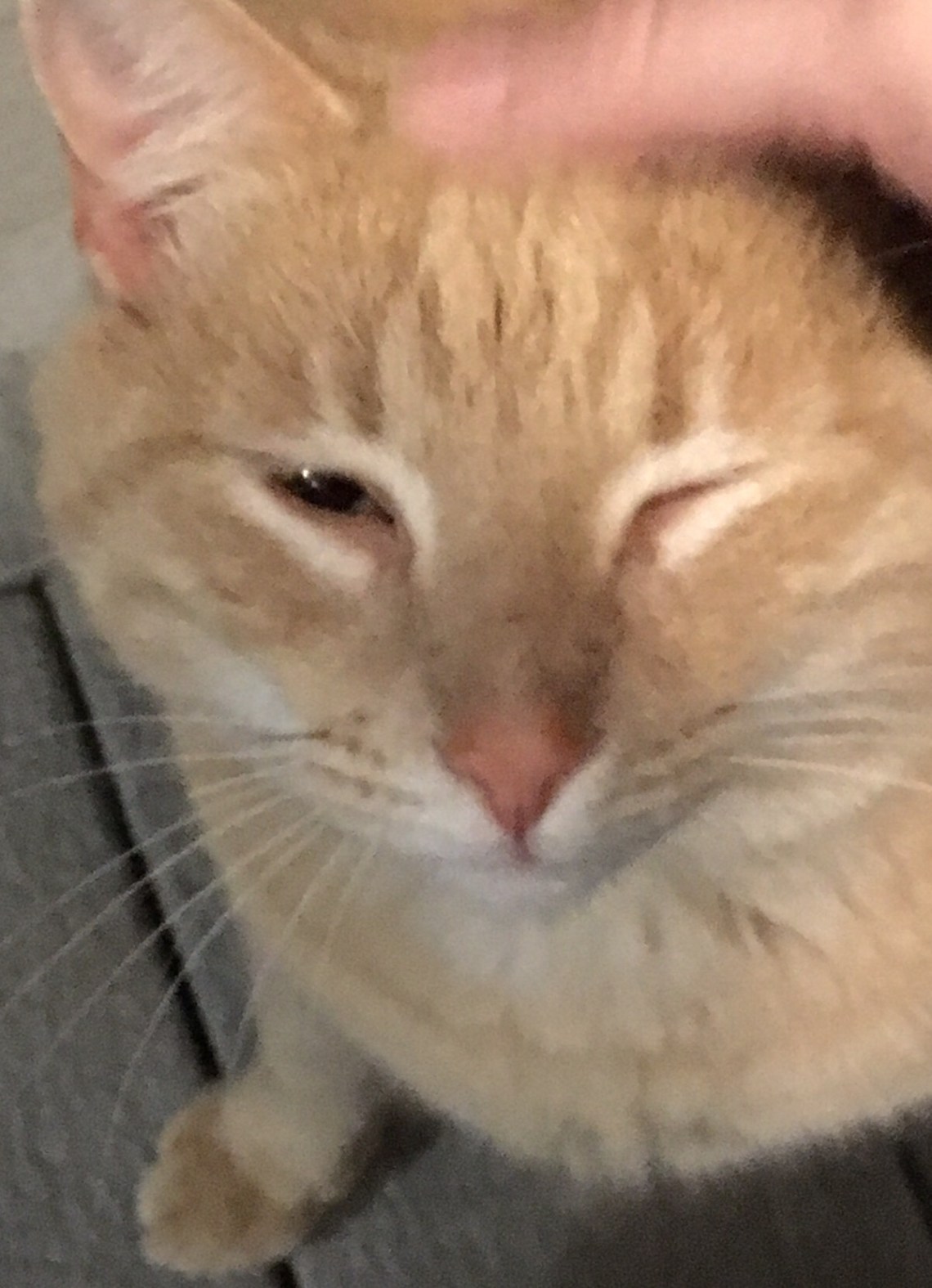 Then one evening last month he came for a visit and I did not have the food out. We noticed that the food was missing, and realized a baby possum was the consumer…so I stopped leaving out the bowl. This time he had to ‘talk’ to me to let me know he was here and hungry. I walked out and he ran partly down the stairs, waited about halfway…I jiggled the food bowl, put it down…and he creeped up the stairs. I calmly sat down next to the bowl while he ate. Here you see him letting me rub his head for the first time. And he REALLY liked it.