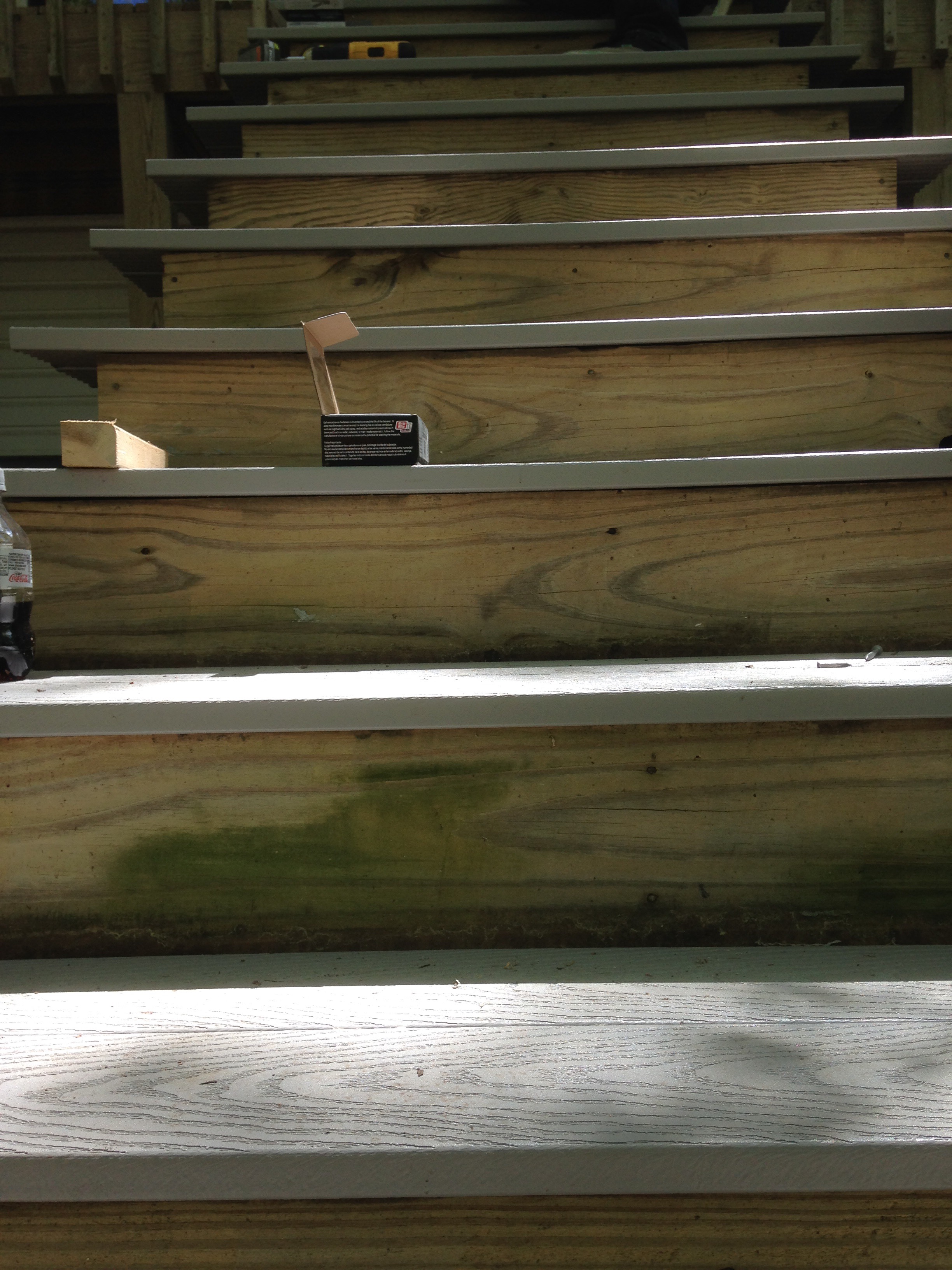 The steps to our back deck were worn and rickety, so we worked all day to replace them. Here you can see the final stage of our progress…many hands make light labor.