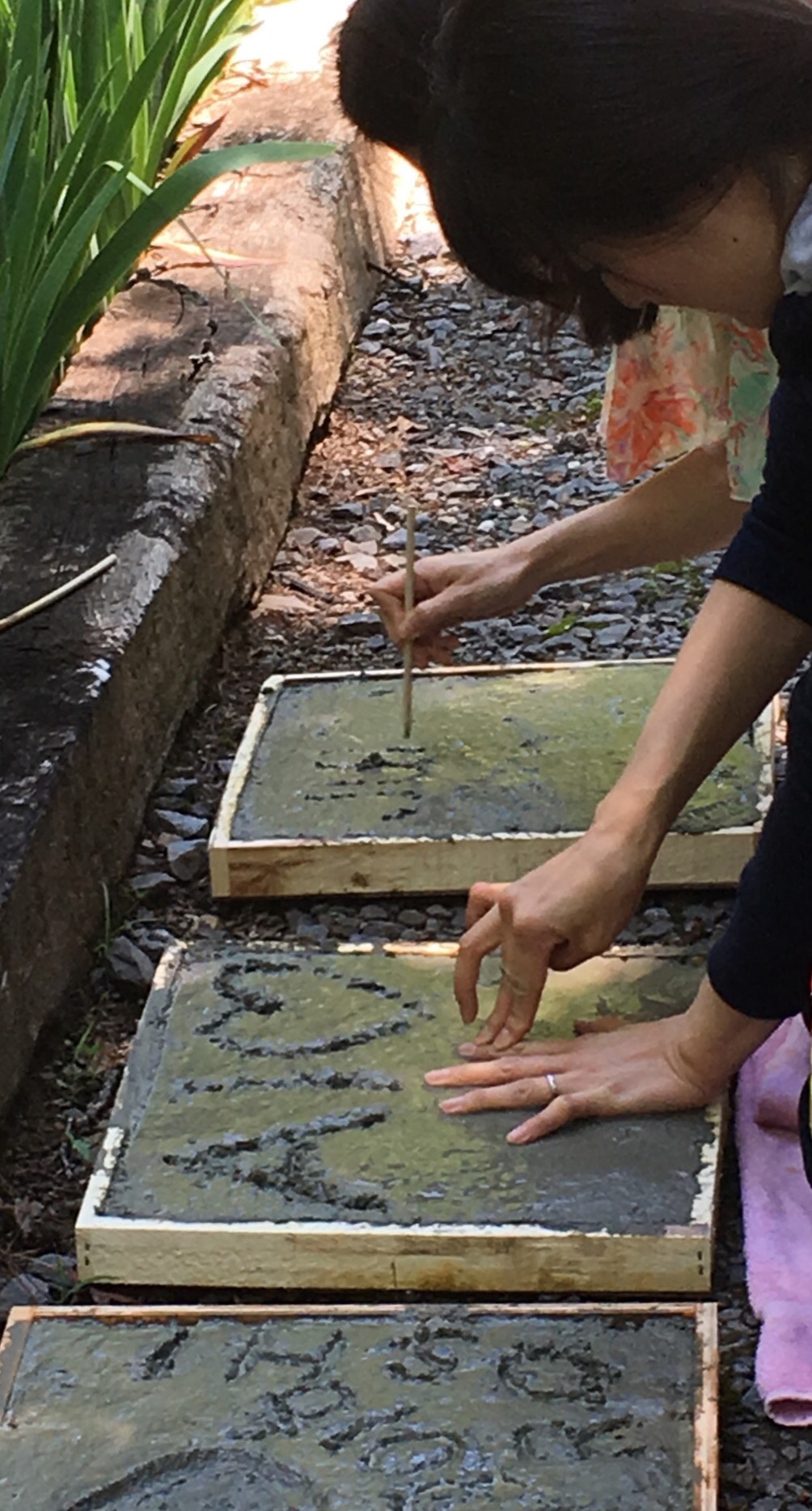 To commemorate their visit, we made stepping stones. My Dad made wooden forms, and cut chicken wire squares to fit into each square form. My son-in-law and nephew mixed enough concrete to fill each square. Then everyone took turns decorating their stepping stone with their name, the year and any idea they wanted to ‘cement’ for years to come. Here you see Junko and Ai working on their steps. We let the steps dry for two days, then broke them out of the molds and placed them in our walkways.
