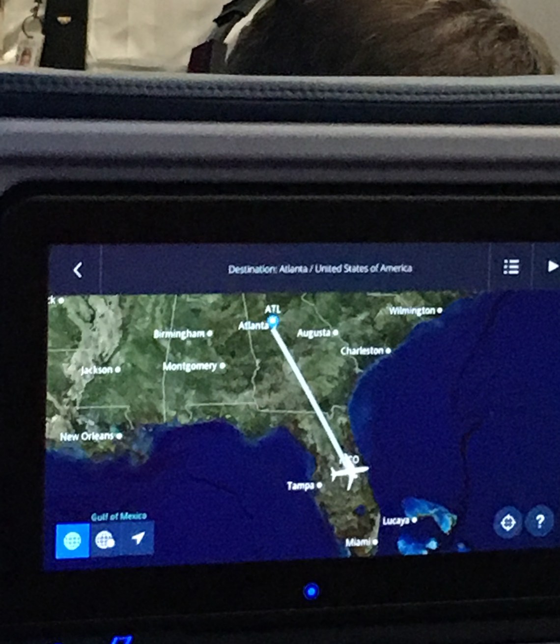 When you travel a lot you learn that the shortest distance between two points may not always be a straight line. Here you see where our flights sits – Orlando – and where we are trying to go – Atlanta. As I am writing this we are almost six hours past our original departure time…with a hopeful 1:00am new departure time on the horizon.