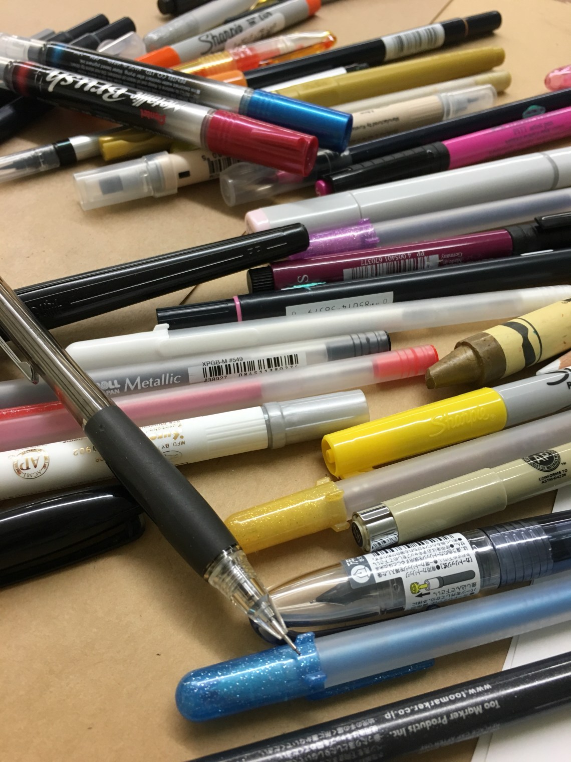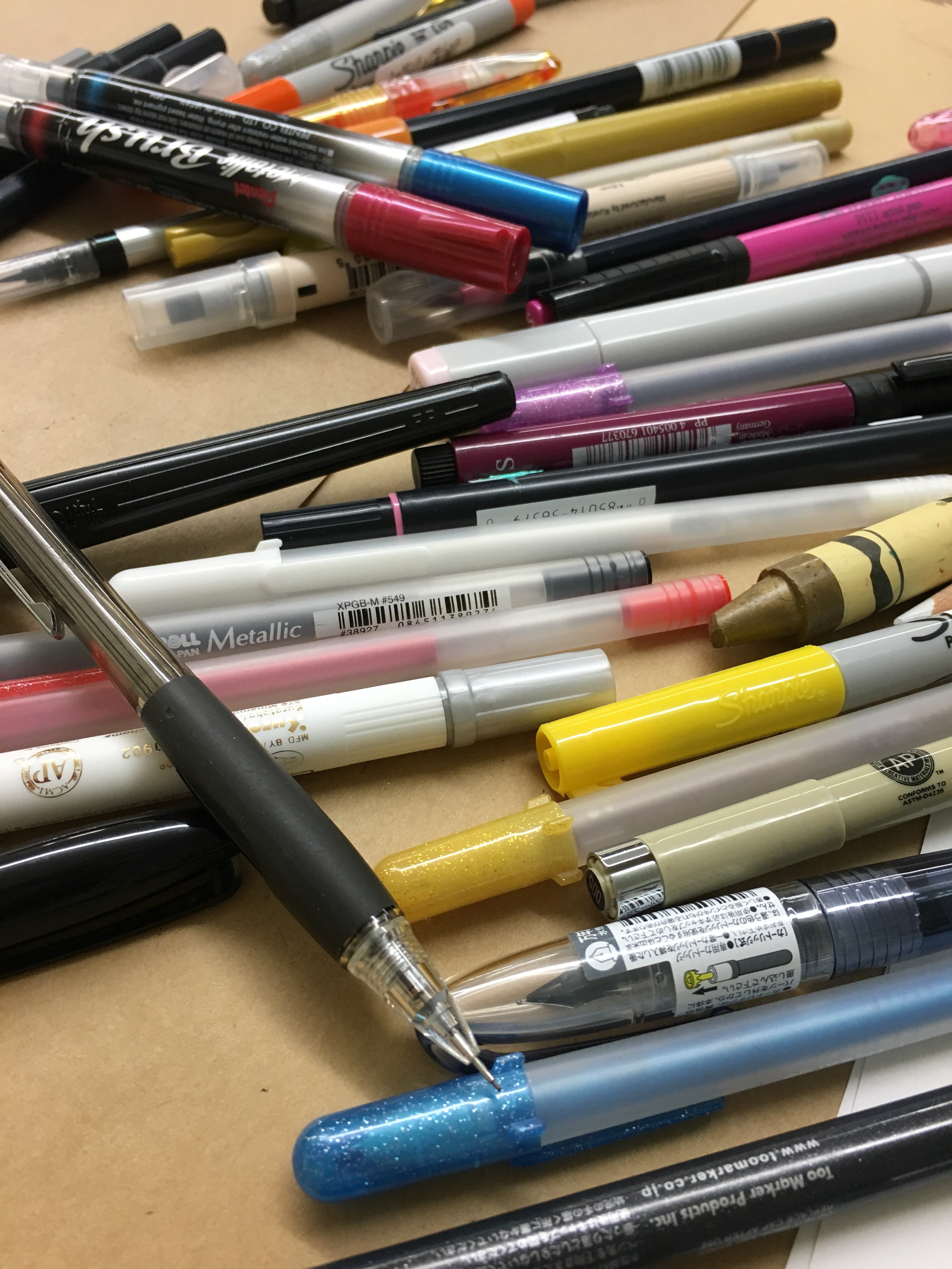 These have been my companions today. We have played with paper and ideas and had fun inventing new works of art. I have eleven drawers of pens, pencils, markers, inks and almost every kind of writing instrument you can imagine. When I am in the studio working on new art I pull out the ones I plan to use and pile them up on my work table. As I write I change from one pen or pencil to a marker then crayon then brush pen as quickly as my hand can move. My work tends to be extemporaneous. I have an idea and I go with it, which means I also fail a lot…lots of crumpled paper and marked up pages.