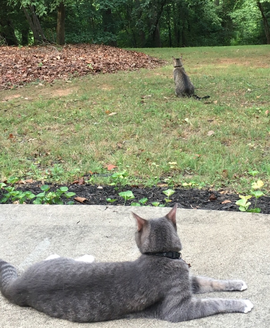 Sometimes we have friends who we enjoy spending time with simply because they are low maintenance. You can hang out and be yourself. Hanging out might mean being in the same place and enjoying that place together in your own way. Here you see Artie & Buschi doing just that, enjoying each other and their ‘domain’. We often find them outside together romping around the yard and being together yet still being themselves.